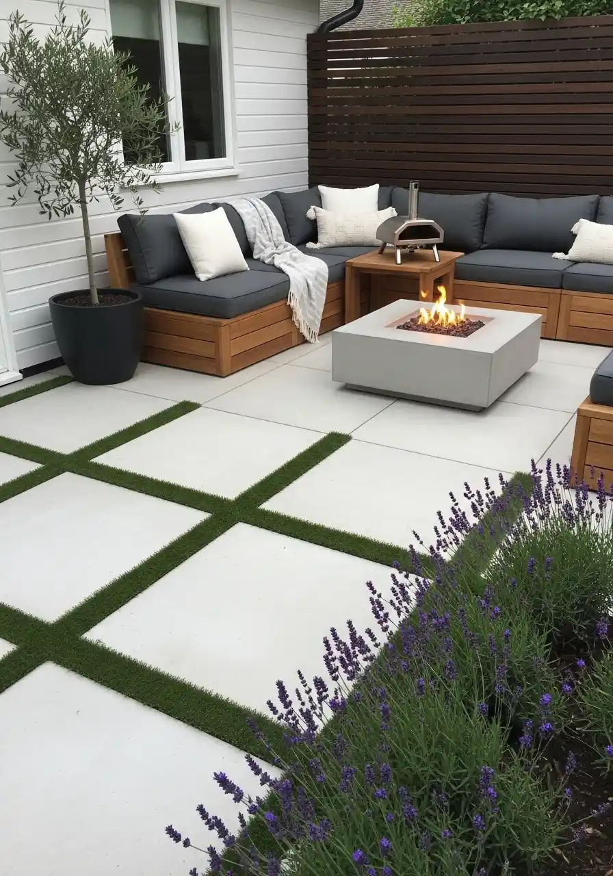 Square backyard landscaping with a grid patio and a cozy fire table corner