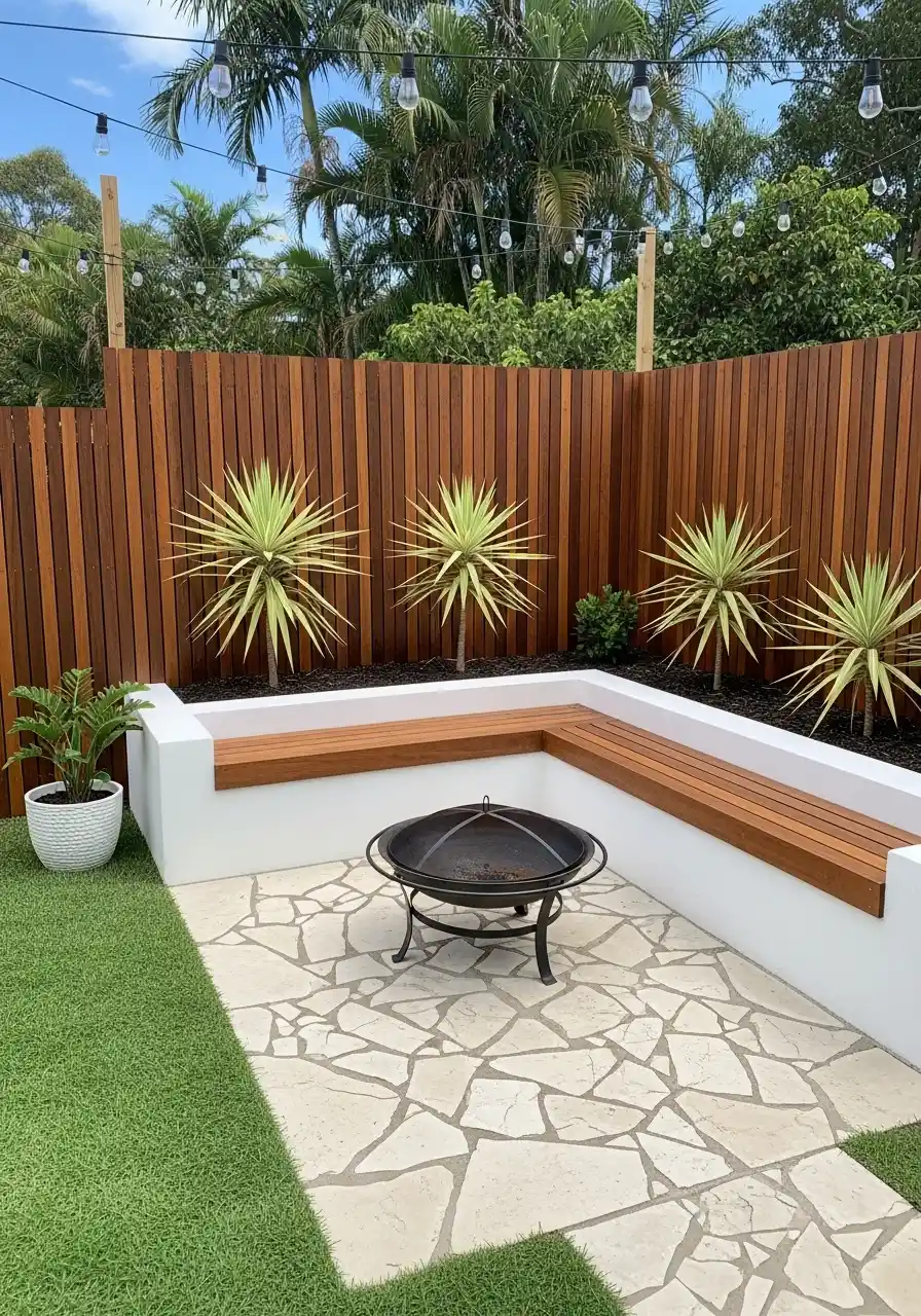 If you want this idea, place the bench tight into the corner so you don’t waste the middle of the yard. Then keep the fire bowl low and centered. You also need a clean fence backdrop. Vertical wood slats look great here because they add texture without clutter. Add a few matching plants behind the bench so the fence doesn’t look bare.