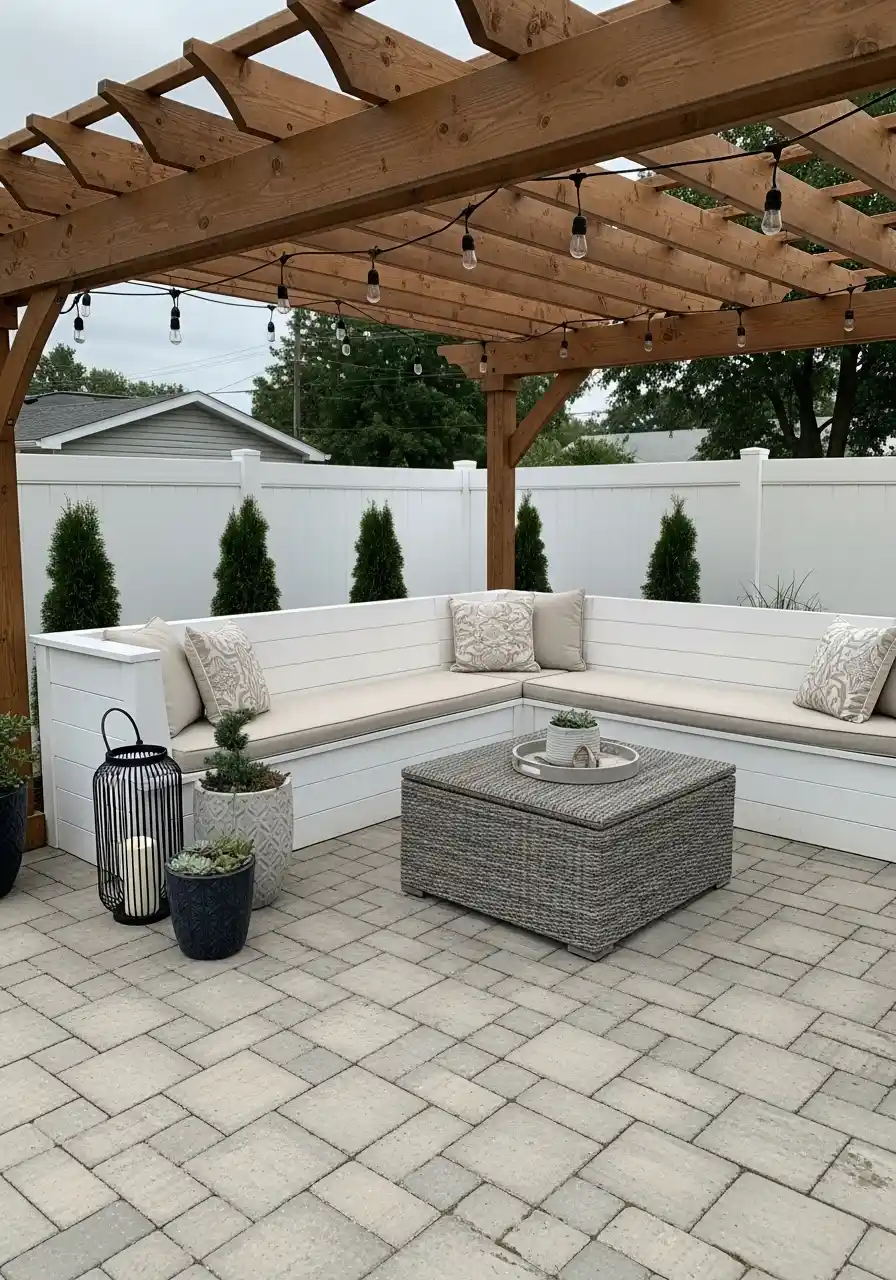 If you do this, keep the paver pattern simple and tight. Then add texture with pillows, planters, and lighting. I’d always anchor a pergola space with a big coffee table or ottoman so the seating feels grounded. And don’t skip the plants. Tall shrubs behind the seating makes the space feel private.