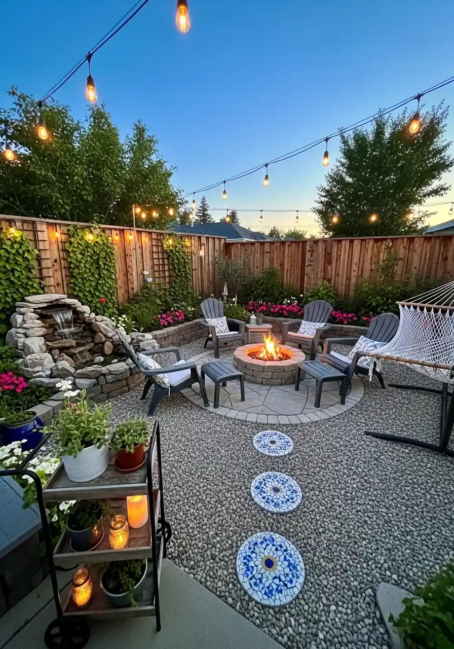 To do this, you basically build a “round room.” Mark your circle first, then set a border so the gravel stays contained. Use a curved bench or curved seat wall if you can. It makes the space feel like a real destination, not just a fire pit dropped on the ground. I’m also a sucker for string lights, and they make this kind of square backyard layout feel warm at night.