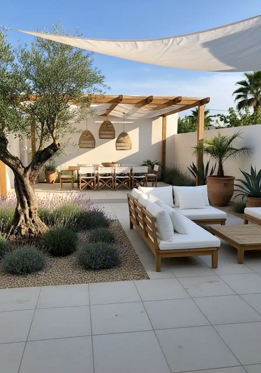 Here’s what makes it work: a focal plant in the middle or back (like a dwarf citrus, olive, or something sculptural), plus shade. Shade changes everything. A shade sail or small canopy makes the space feel like it’s hugging you. Also, use gravel or small stone underfoot so water drains well. And add a woven chair or wicker bench so the hard surfaces don’t feel cold.