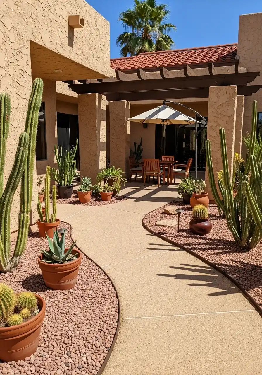 Patio courtyard with potted cactus, curved bed lines, and easy entertaining space