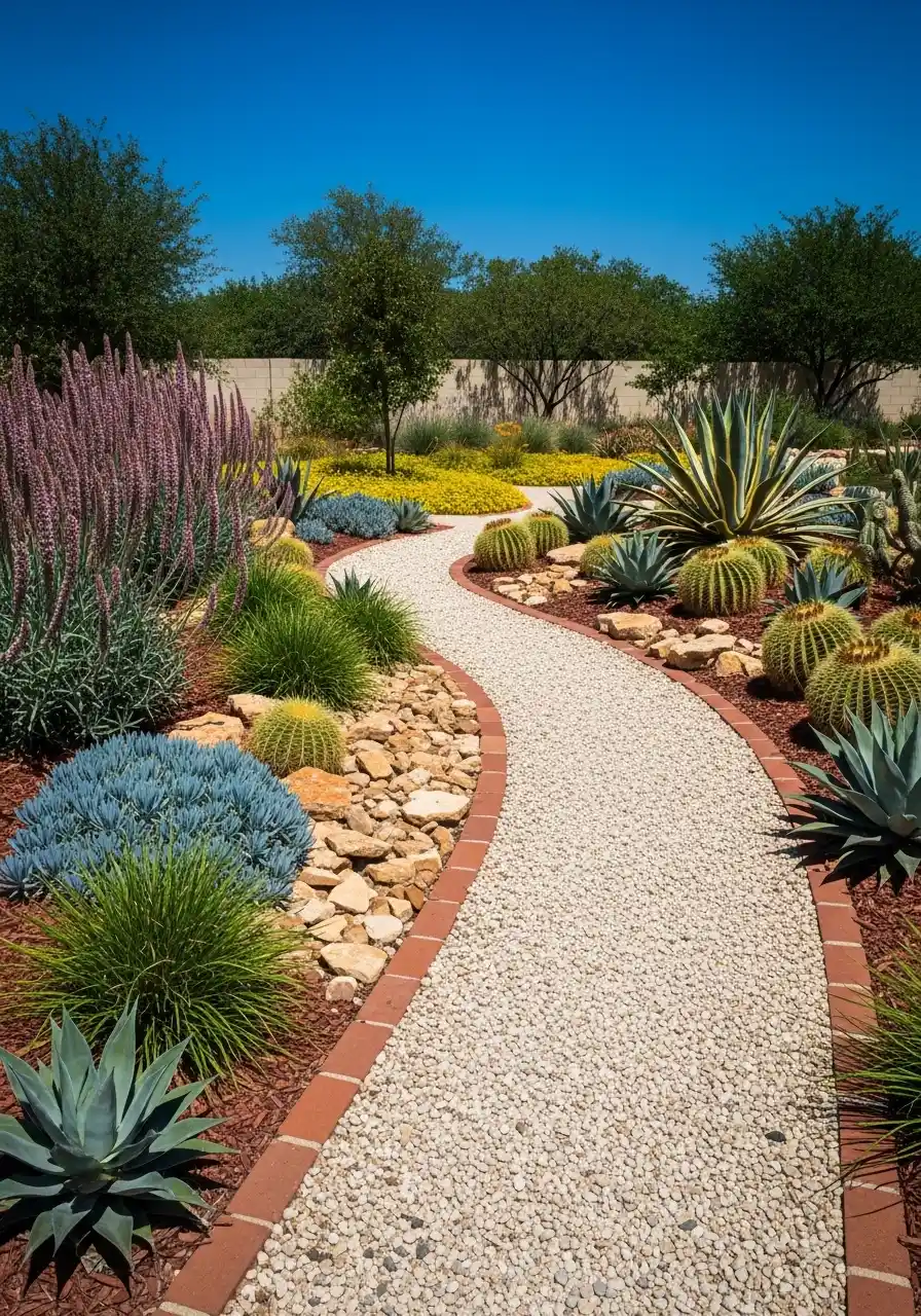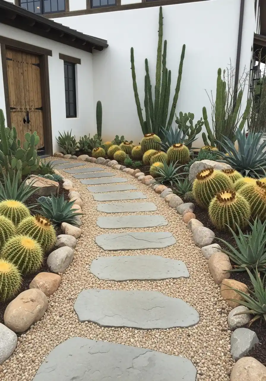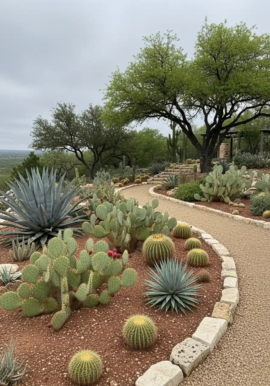 For desert landscaping in Texas, this “trail” style is great if you want a yard that feels like an experience. The trick is curving paths and layered height. Put taller cactus and yucca-looking plants toward the back, then medium shrubs and agaves, then low plants near the path edge. It makes the path feel protected.