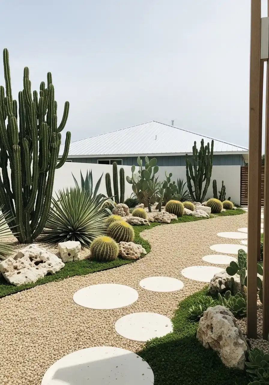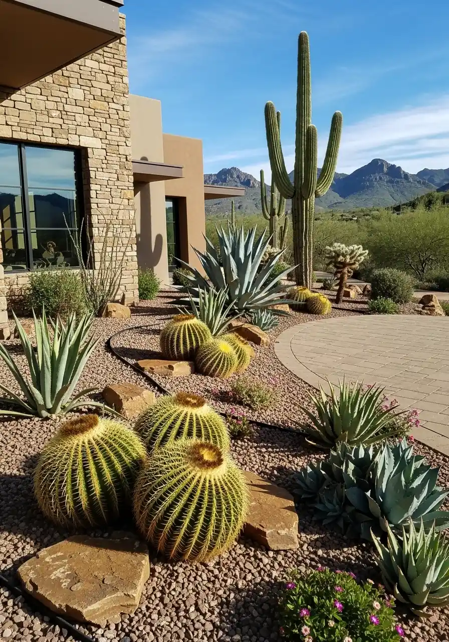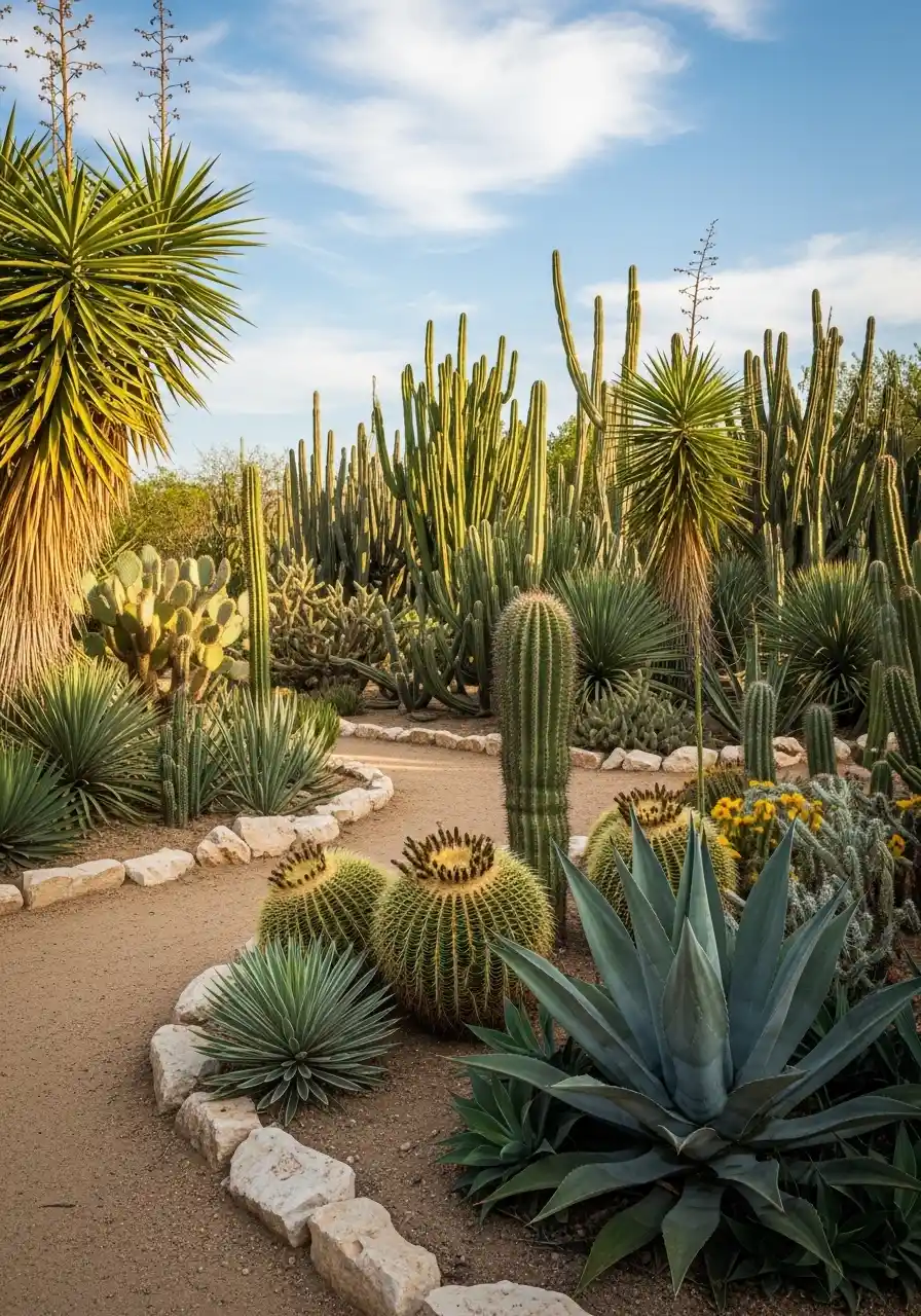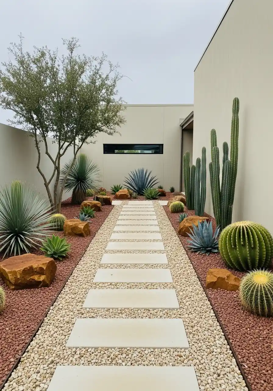 For desert landscaping in Texas, this “trail” style is great if you want a yard that feels like an experience. The trick is curving paths and layered height. Put taller cactus and yucca-looking plants toward the back, then medium shrubs and agaves, then low plants near the path edge. It makes the path feel protected.