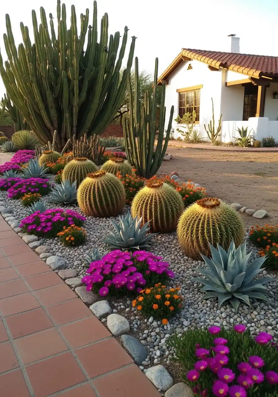 This is the party version of texas desert landscaping. The barrel cactus are lined up like little golden guards, and then the hot pink flowers steal the show. I love how the flowers are low, because the cactus still stands out. And the pebble ground cover makes everything look neat and clean. It’s colorful but still desert-appropriate, which is harder than it sounds.
