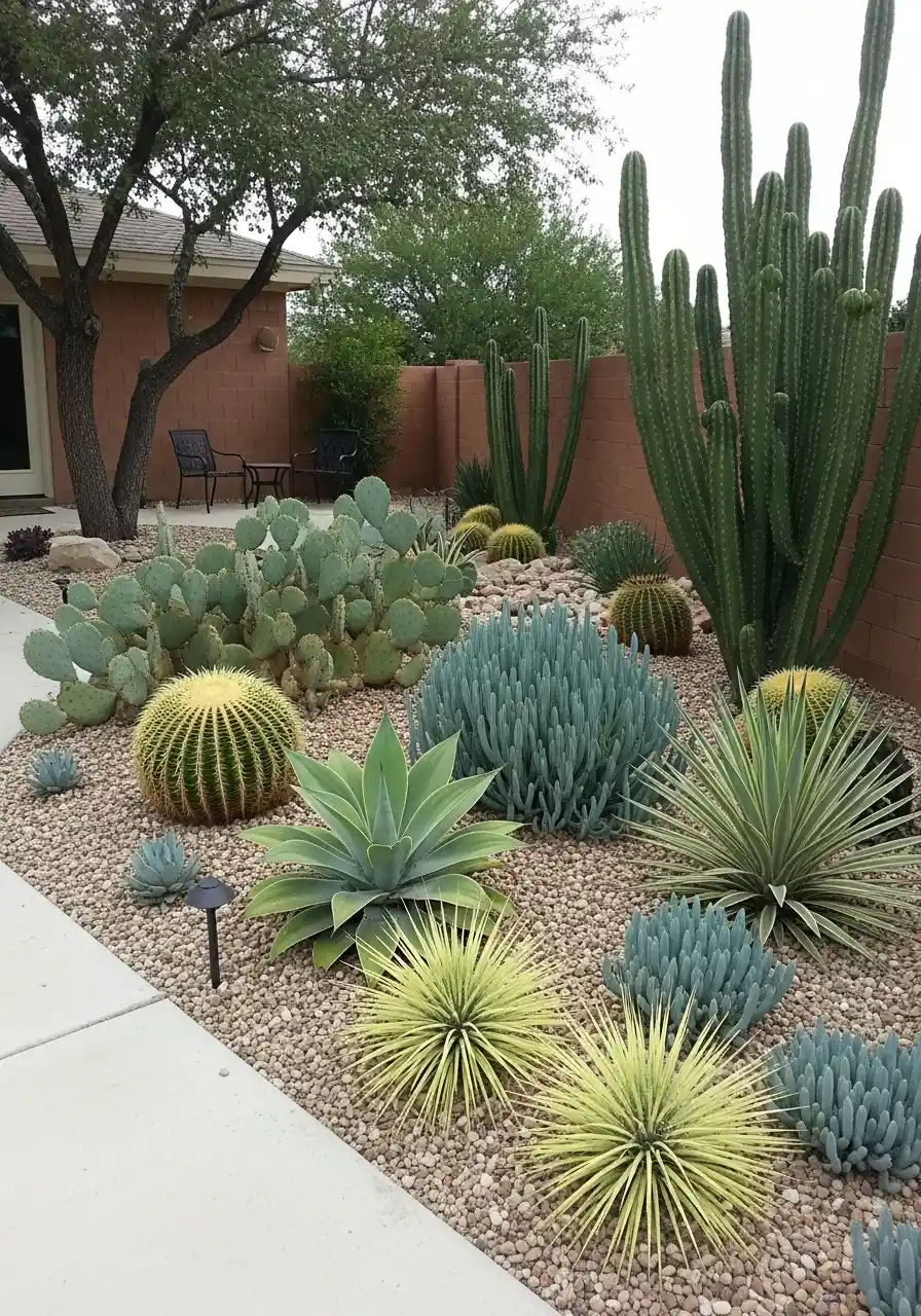 For texas desert landscaping in a backyard, focus on comfort. Put gravel underfoot but use large stepping pads so you don’t feel like you’re walking on marbles. Then place 3–6 tall plants around the edges to frame the seating spot like an outdoor room.