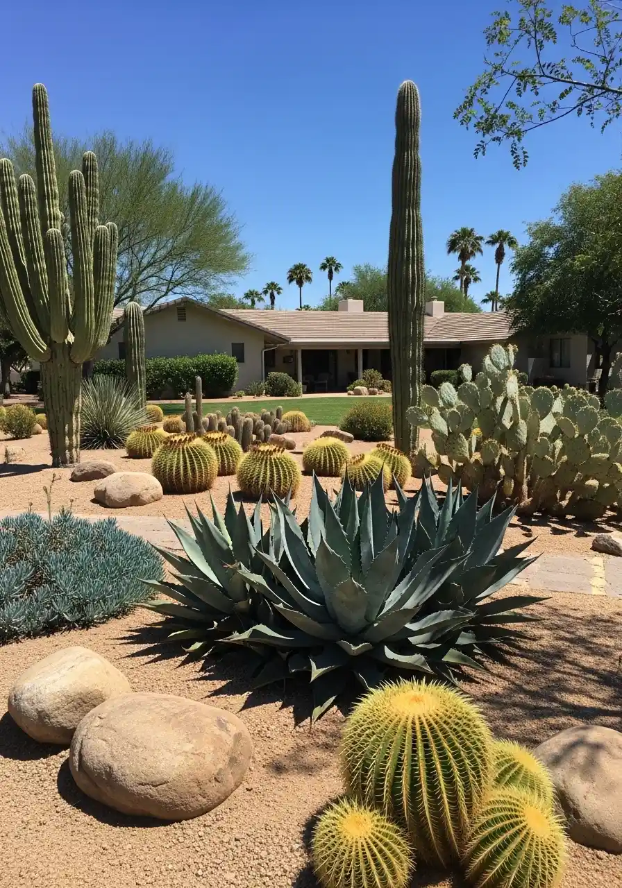 Classic desert yard with saguaros, barrel cactus, and wide open space