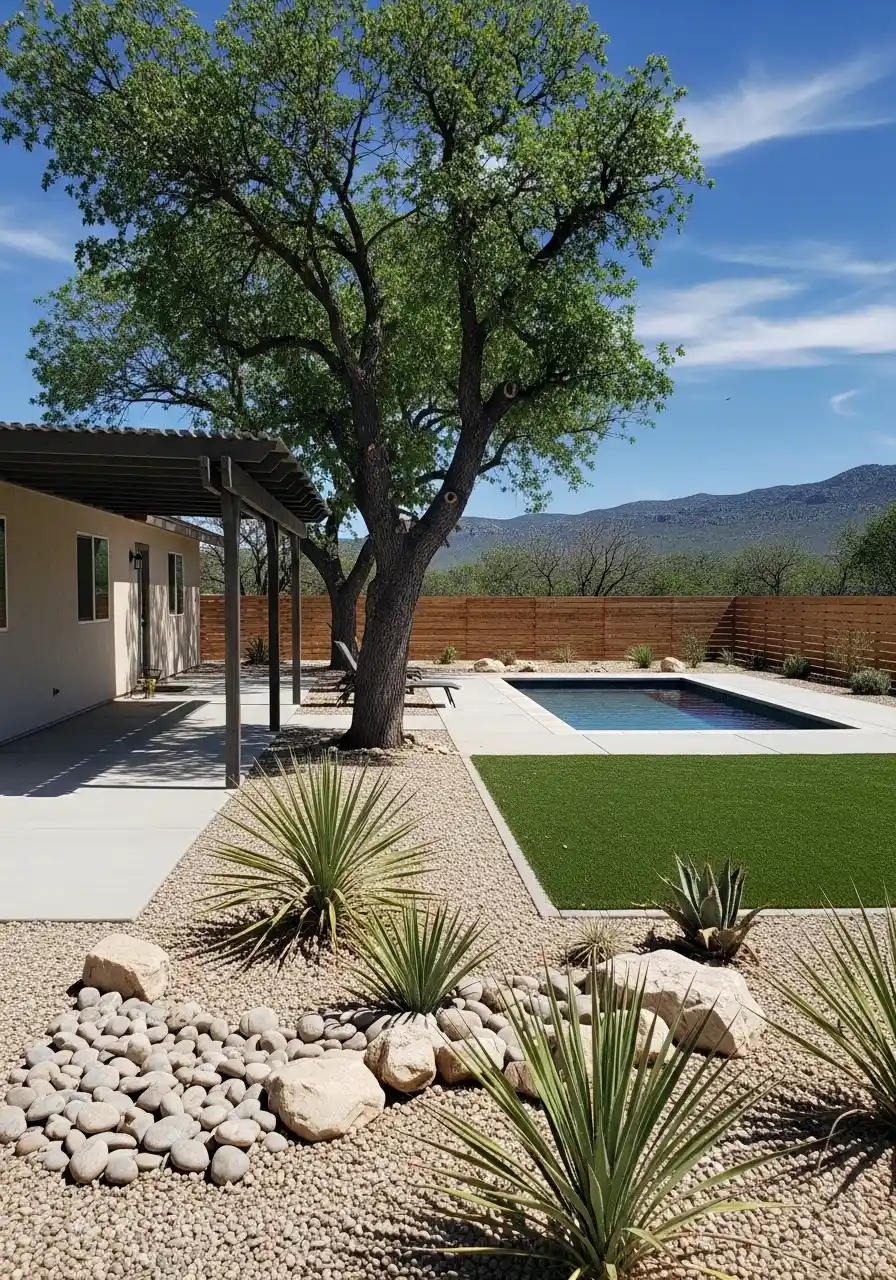 This last one feels like a resort, not a regular yard. Gravel keeps it dry and neat. The yuccas bring that spiky desert energy. The boulders make it feel natural. And the turf patch adds a clean green block without the watering guilt.