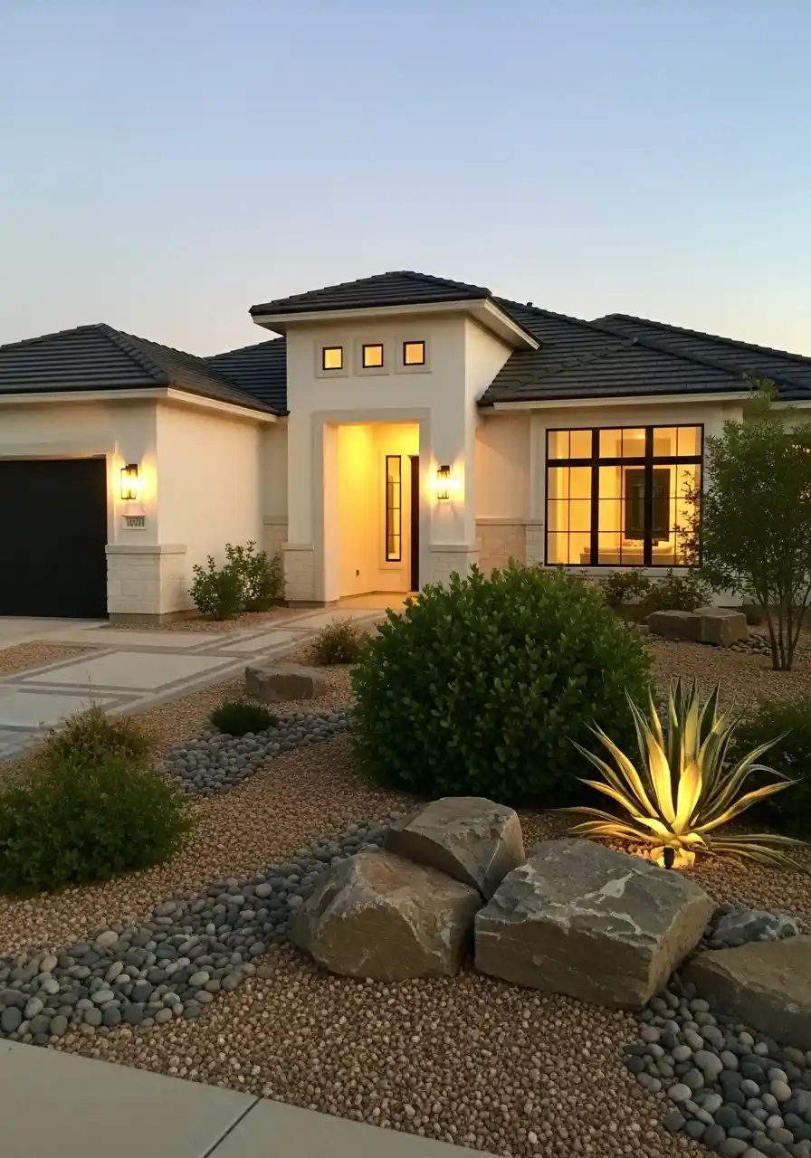 This image is a vibe because of the lighting. It’s dusk, the house lights are warm, and there’s an agave uplighted like it’s on stage. A good texas landscaping front yard should look nice at 7pm too, not just at noon. The rock “river” bed adds texture, and the mix of small shrubs and bigger boulders keeps it grounded.