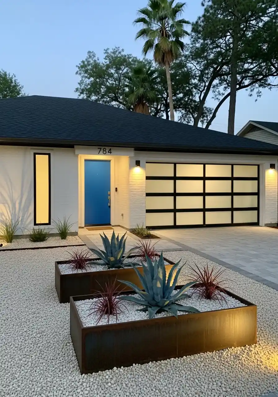 This one is my favorite kind of clean. White gravel, raised metal planters, bold agaves, and that blue front door. It’s sharp, modern, and honestly a little bit “don’t step on my stuff.” I respect it. The raised beds also help if your soil is trash, which is common in parts of Texas.