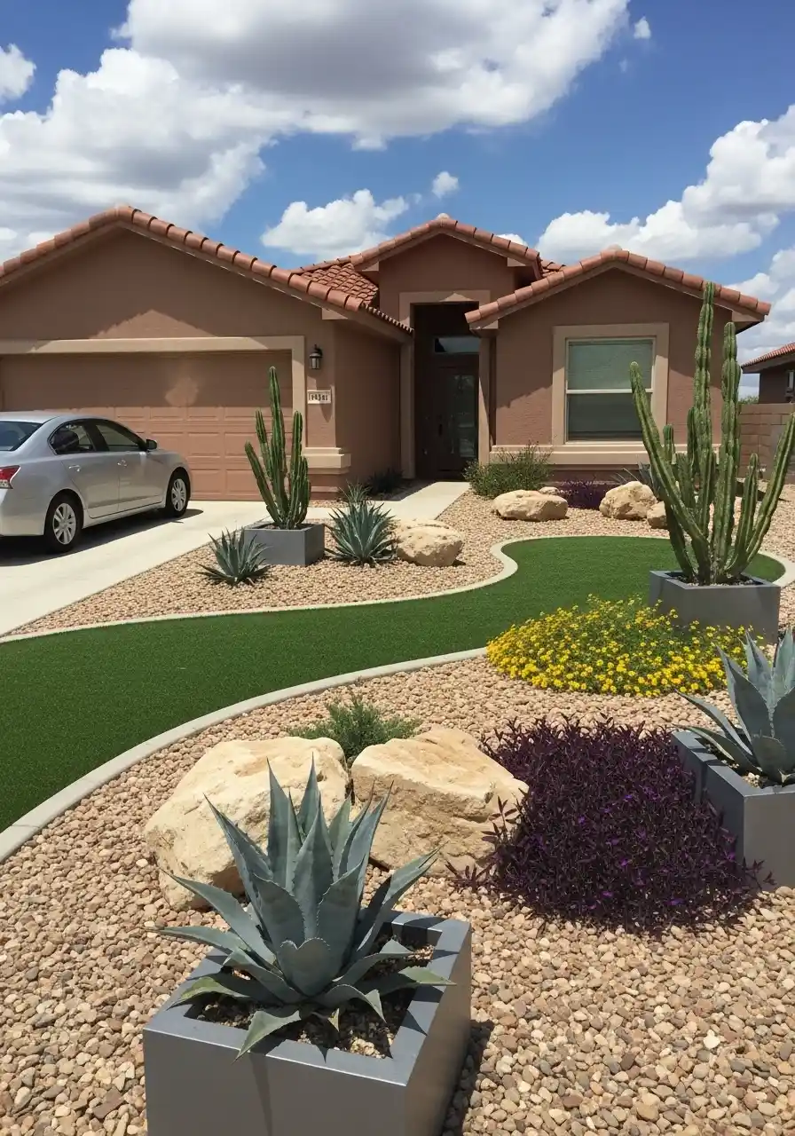 This image mixes turf and desert rock, and I have opinions. I like it when turf is used as a shape, not a full fake lawn. The curvy green ribbon makes the space feel softer, and it gives your eyes a break from all the tan gravel. In a texas landscaping front yard, that contrast can be the difference between “nice” and “wow.”