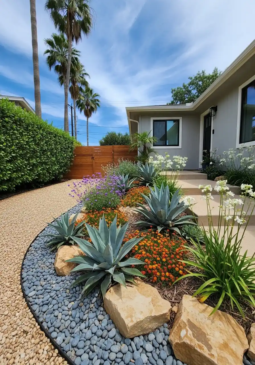 Texas landscaping front yard with layered flower color, river rock borders, and agave anchors