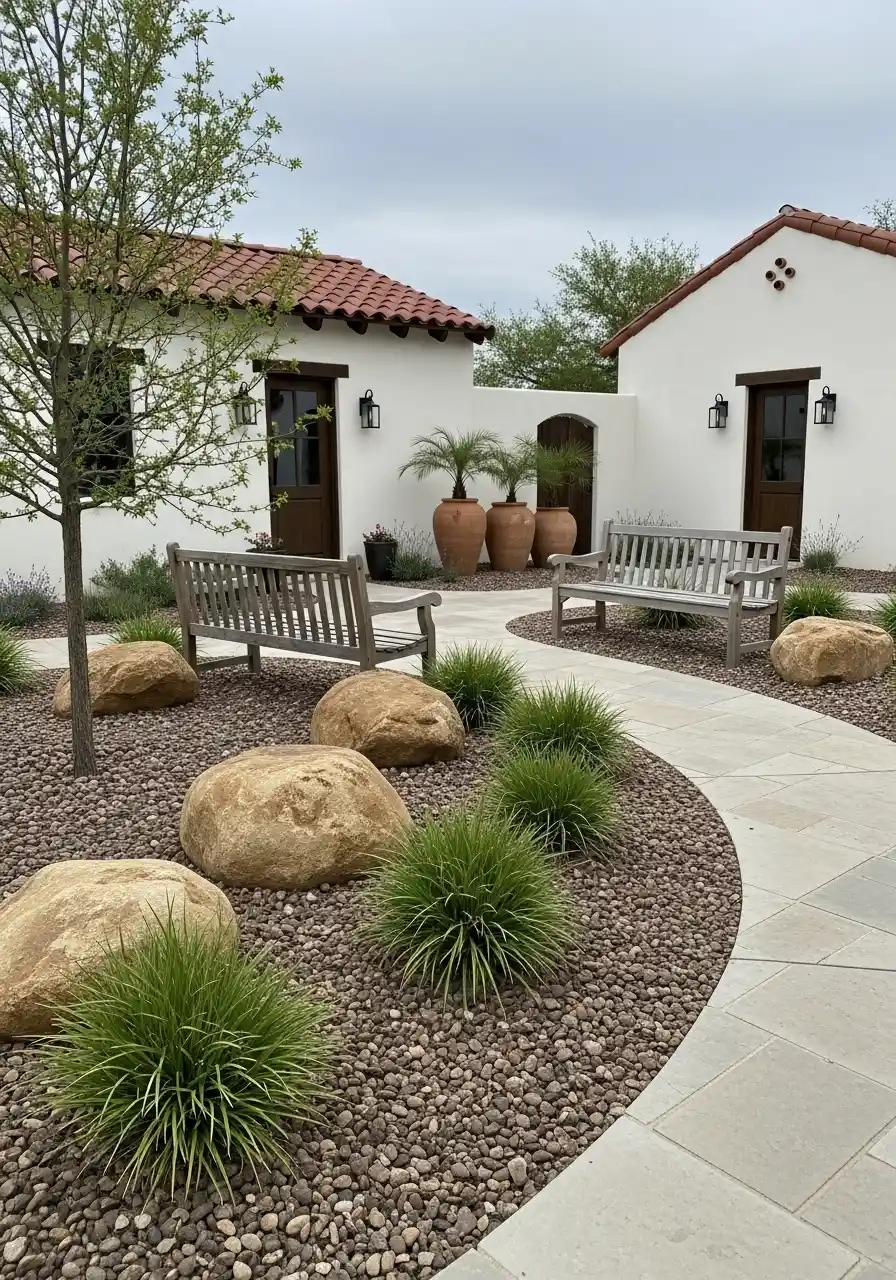 Spanish-style courtyard entry with benches, boulders, and big clay pots