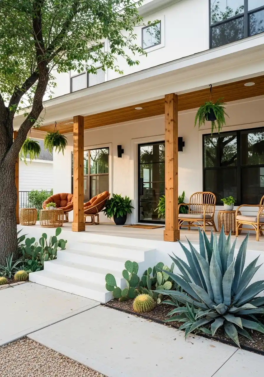 Modern farmhouse porch with agave, prickly pear, and clean concrete