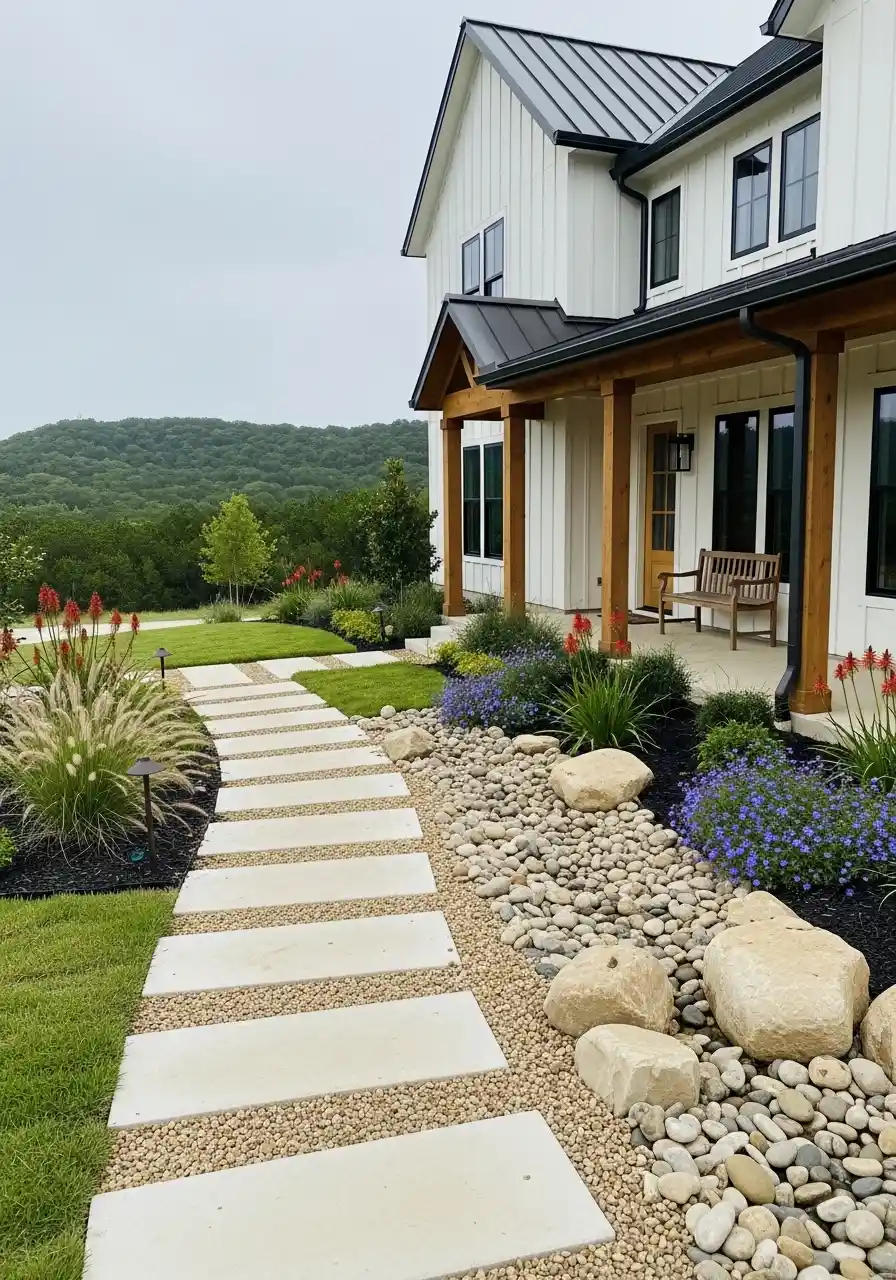 If you want this Texas front yard landscaping look, start with the curve. Don’t make the path straight unless your house is super modern. A soft curve hides the whole yard at once, so it feels bigger. Then add river rock on both sides, not just one. It frames the walkway like a picture.