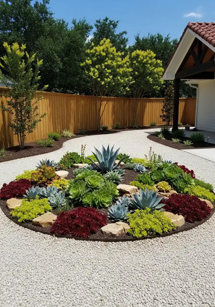 Hack: use a clean edging strip so the circle stays crisp. Plant succulents in repeating patterns, not random. You’ll get that “designer” look fast. And mulch with gravel to keep weeds from acting rude.