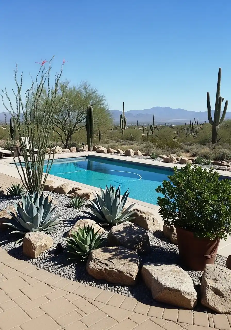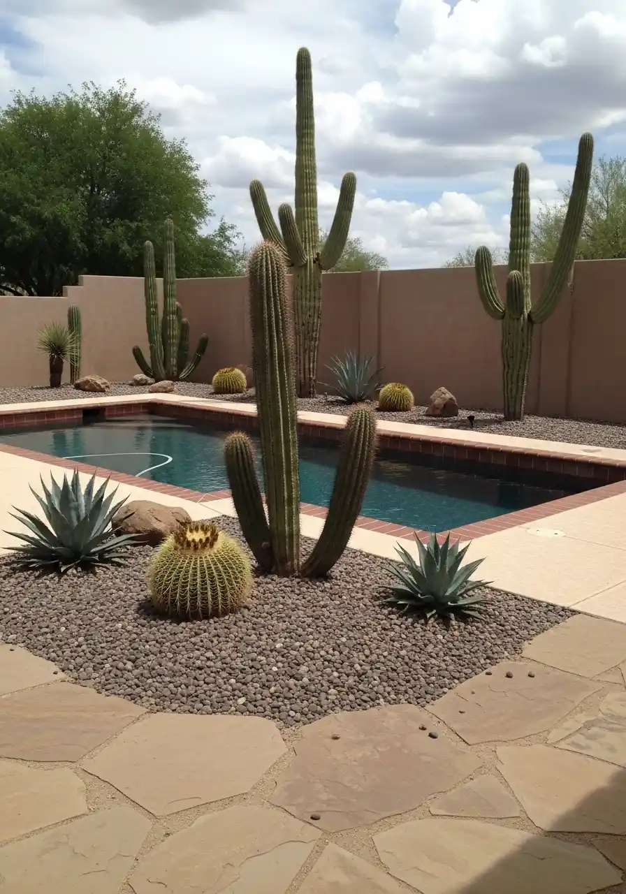 Okay, I’ll admit it. Desert planting around water looks weird in my head sometimes. But when it’s done clean, it looks sharp. The key is contrast: smooth pool deck, bold cactus shapes, and tidy gravel.