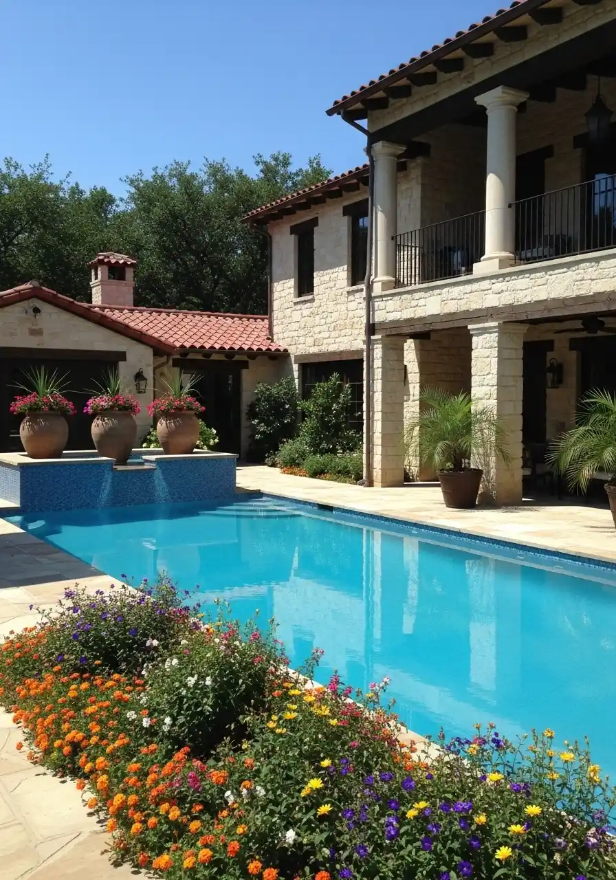 Go vertical when you don’t have room to go wide. Vines, wall planters, tall skinny pots, and upward lighting make it feel bigger than it is. Keep furniture simple and low so you don’t block the view of the water. And don’t overload the plant types. A few repeats look calmer. This is one of those pool landscaping ideas for Texas that’s super realistic for city homes.