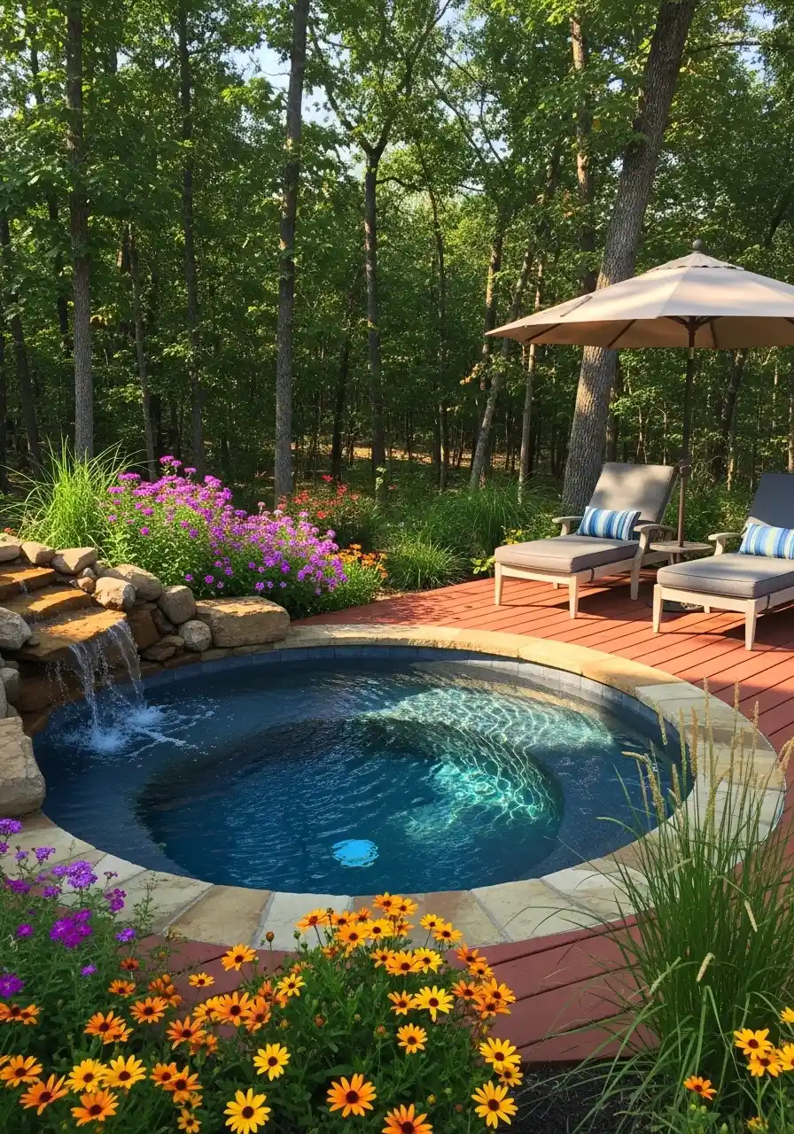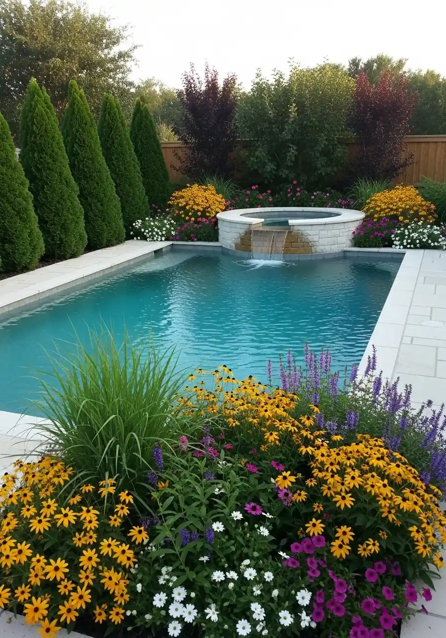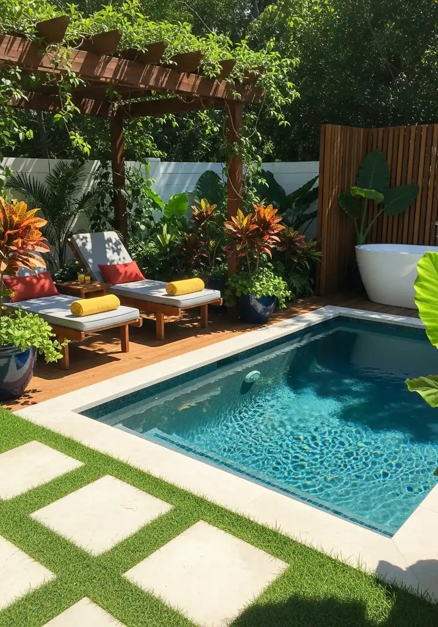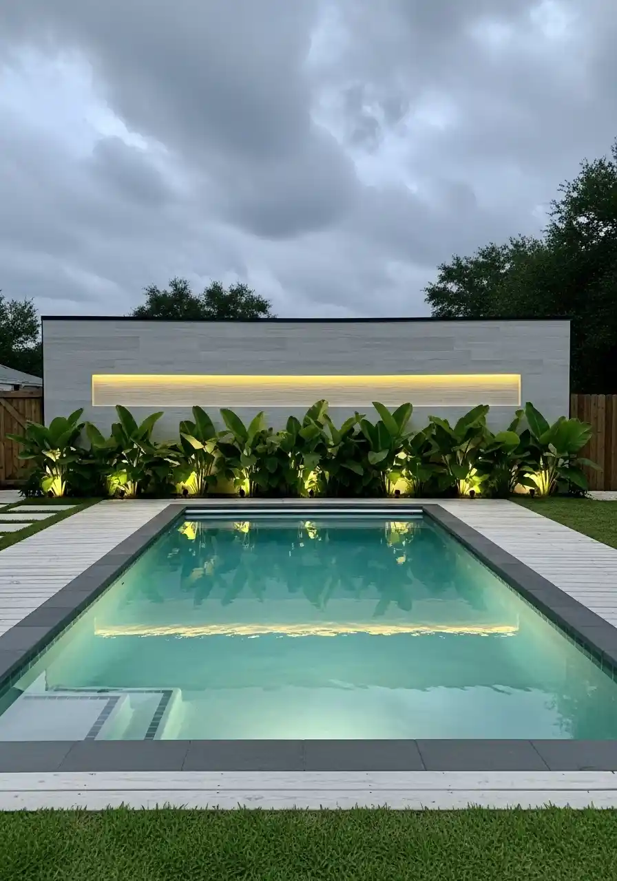Go for plants that look lush but don’t drop a million leaves into the water. Think palms (the tougher kind), bird of paradise look-alikes, and thick-leaf tropicals. Put them in a raised strip or behind a low wall so the pool edge stays clean. I’d also add a little ground lighting aimed up into the fronds, because at night it looks magical and it also helps you not trip walking to your chair.