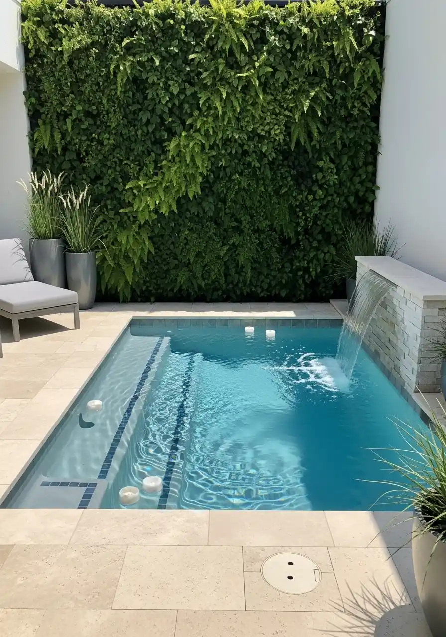 Okay this one is dramatic, in a good way. A small plunge pool with a sheet waterfall spilling from a clean box, and a tall green wall behind it. It feels private and cool, like you could hide from the whole world for an hour.