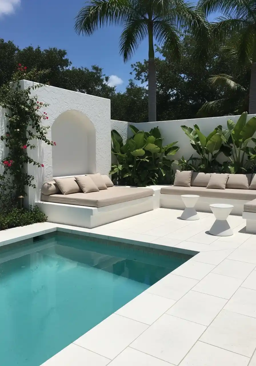 If you do this, keep the deck light colored so it doesn’t turn into a frying pan. Add a built-in daybed or a deep lounge bench, because people actually use it. Plant a row of palms or tall tropicals along the wall, then fill in with smaller plants that don’t poke you when you walk by. A small bonus hack: add a few fragrance plants away from the pool edge, like jasmine, so the air smells good but petals aren’t floating everywhere.