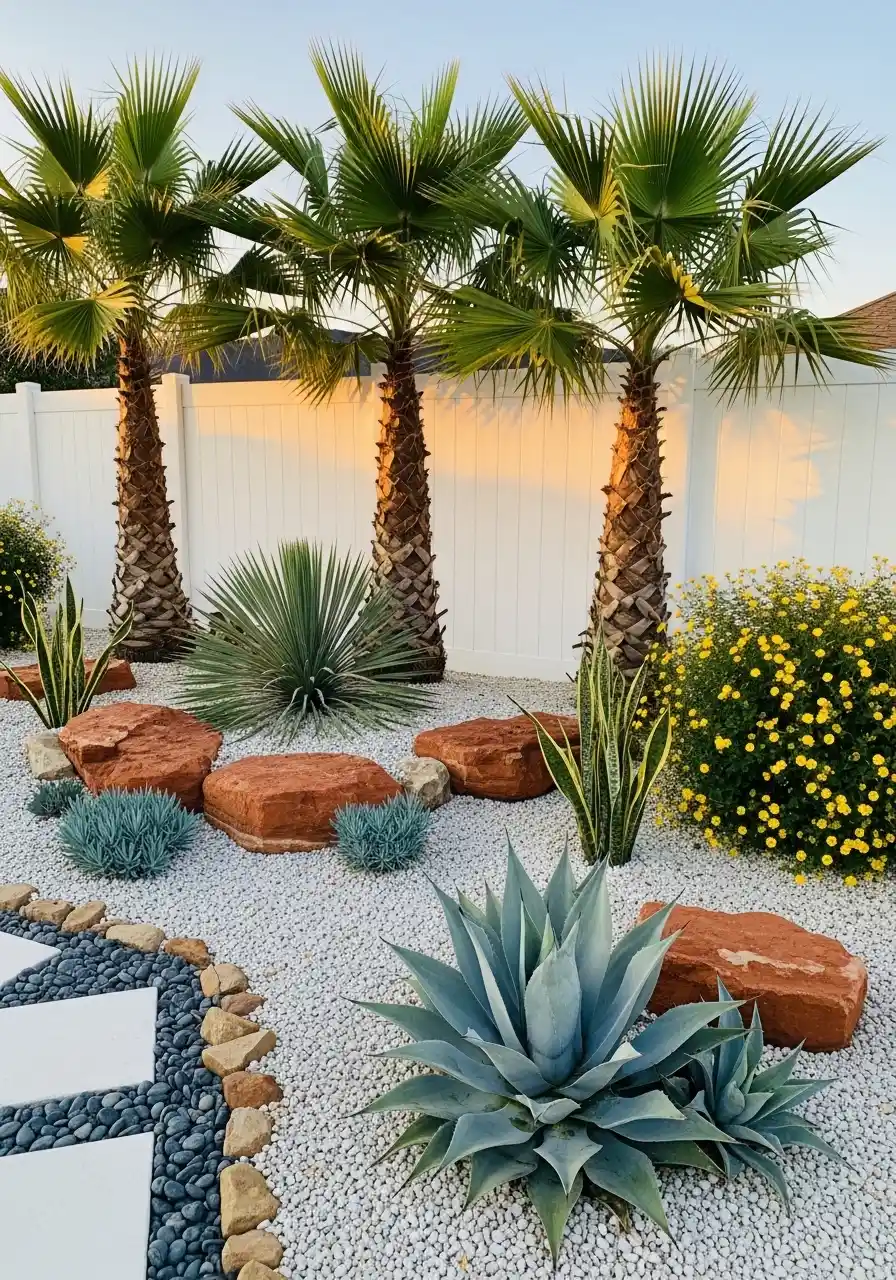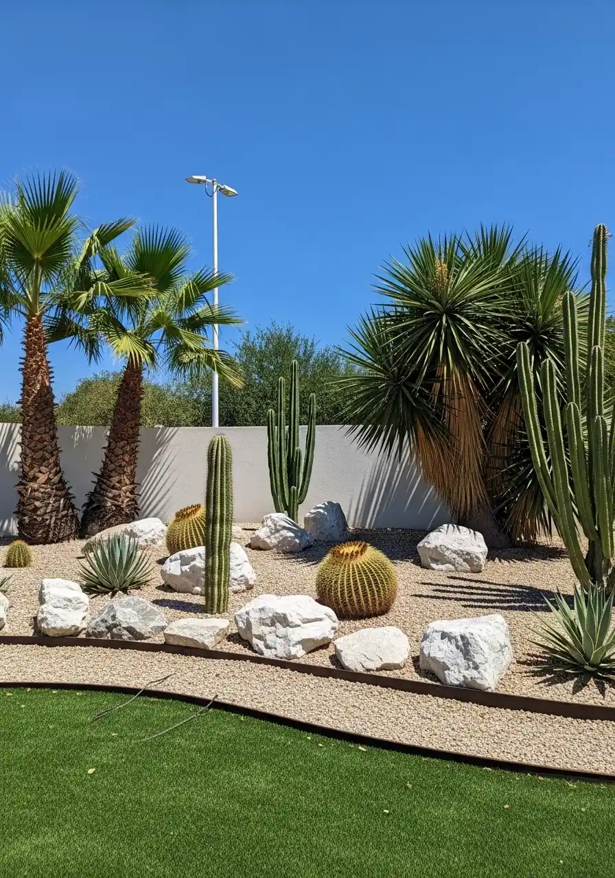 This one feels like a modern sculpture garden, but still friendly. The white boulders are what make it pop. They reflect light and keep everything from looking heavy. And the mix of palms with yucca-type plants and tall cactus gives it layers without needing flowers.