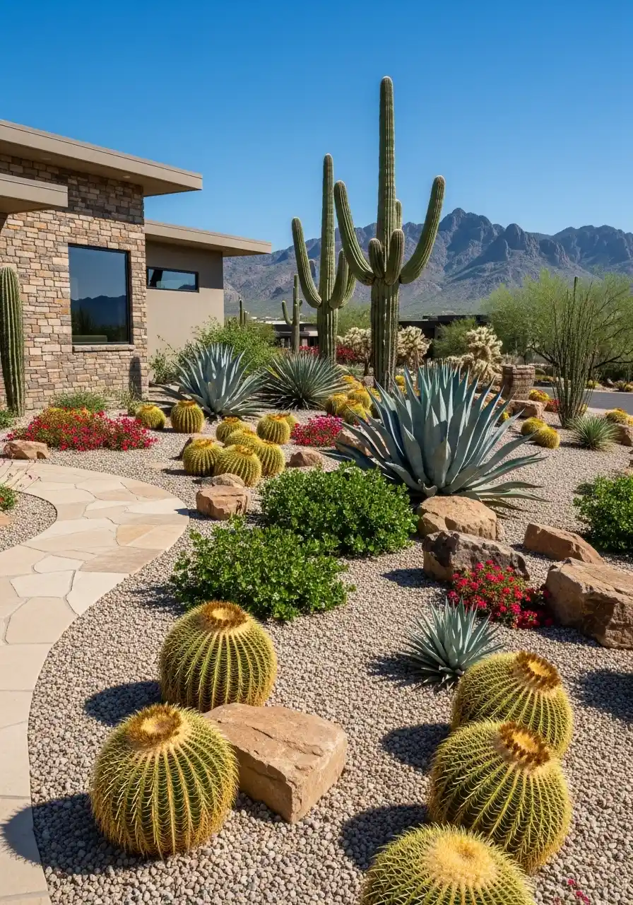 Texas xeriscape landscaping front yard with barrel cactus clusters and a bold mountain vibe