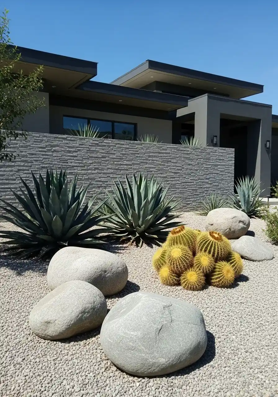 This is the sleek one. The house lines are sharp, so the landscape matches it. Big agaves, rounded boulders, and a simple gravel base. It’s clean, almost quiet, like the yard is whispering instead of yelling. I kinda prefer this style when the house is modern, because flowers can look too “busy” against those straight walls.