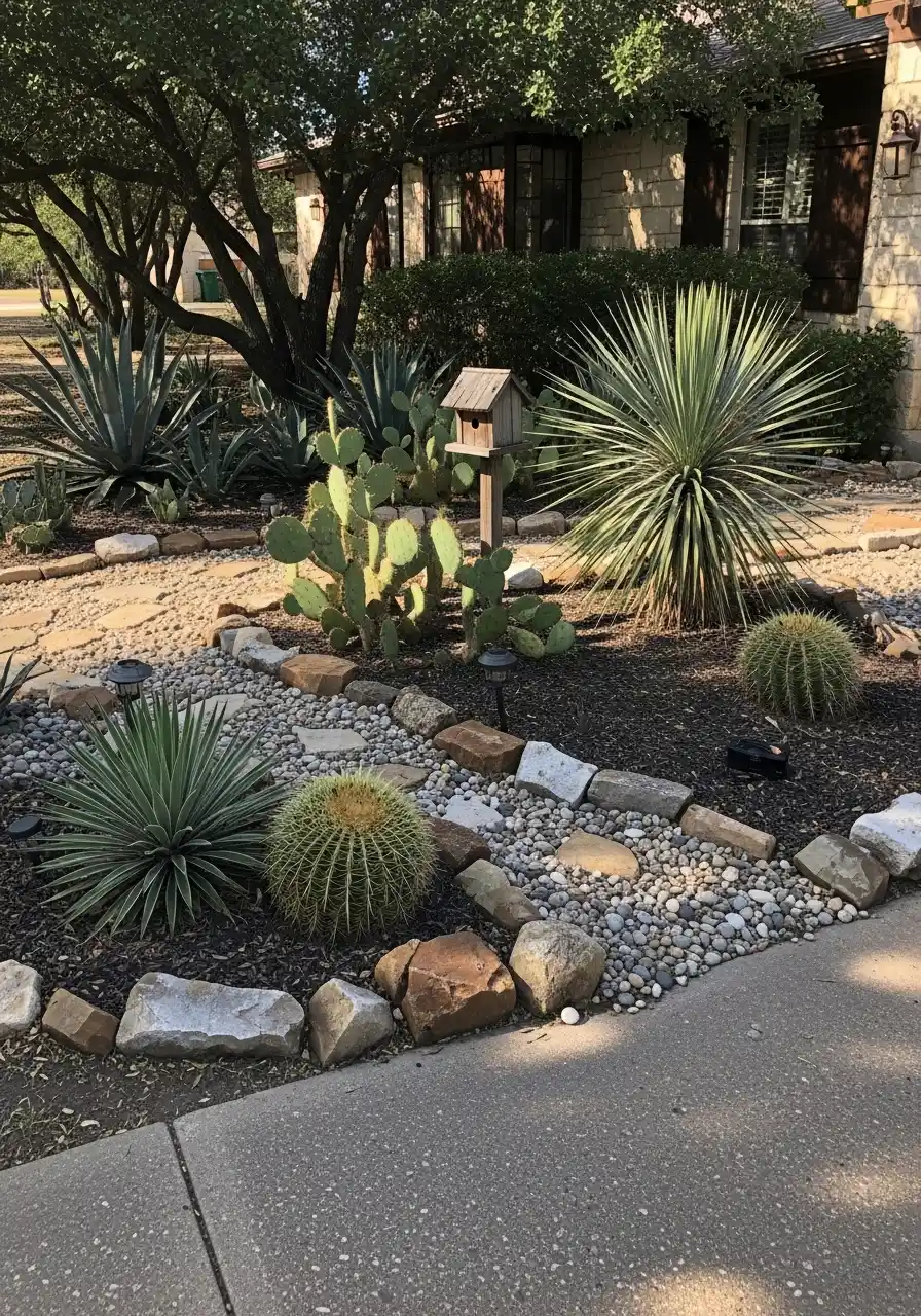Shady front yard xeriscape with prickly pear, birdhouse charm, and mixed edging
