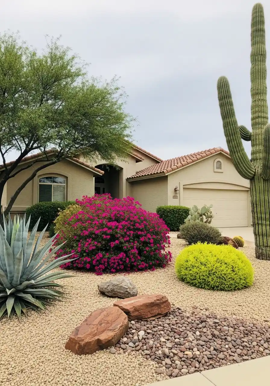 My personal opinion, this is one of the best xeriscape landscaping ideas for a Texas front yard because it looks high-end but it’s still low watering once established. The big tip is spacing. Desert plants grow slower, but they still grow, and crowding becomes a pain later.