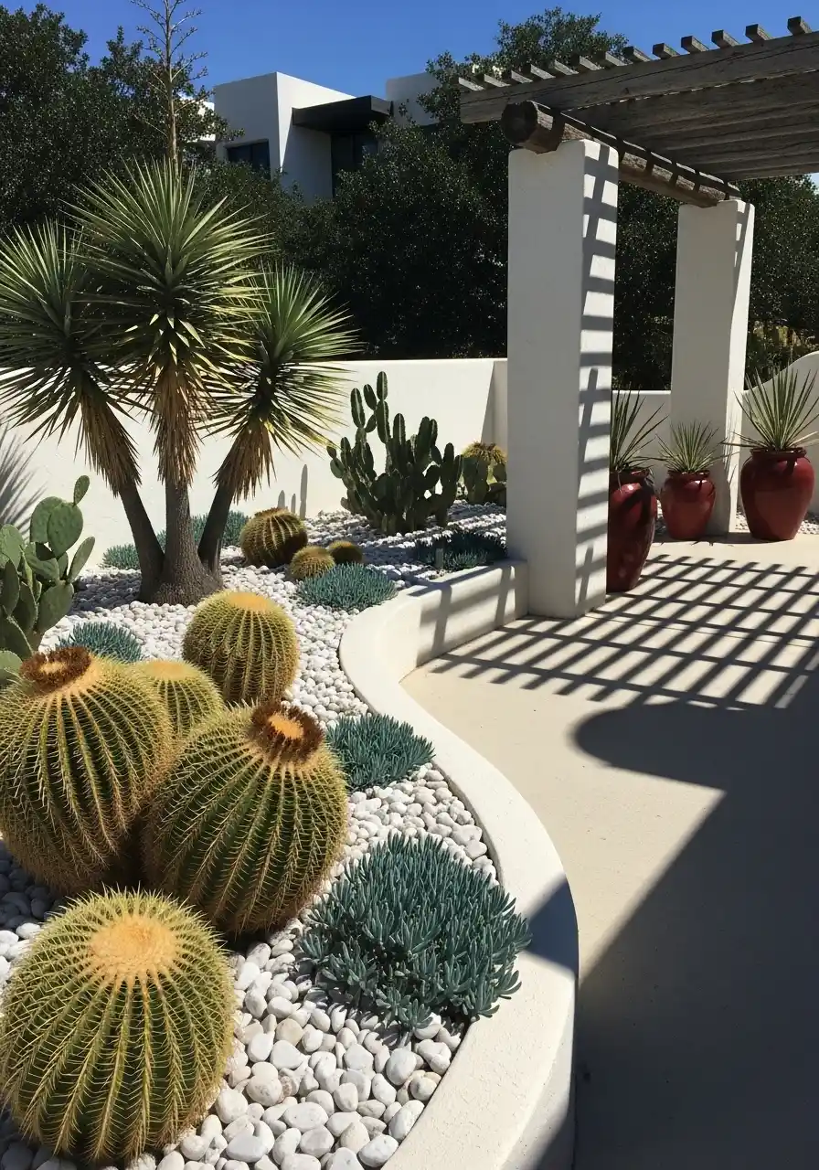 For Texas front yard xeriscape landscaping, this idea is amazing if you have a porch or pergola area. Use white rock in small zones as an accent, not everywhere. White rock can glare in full sun. But in filtered shade, it looks clean and bright. Then cluster barrel cactus in groups of 3–7. Clusters look intentional.
