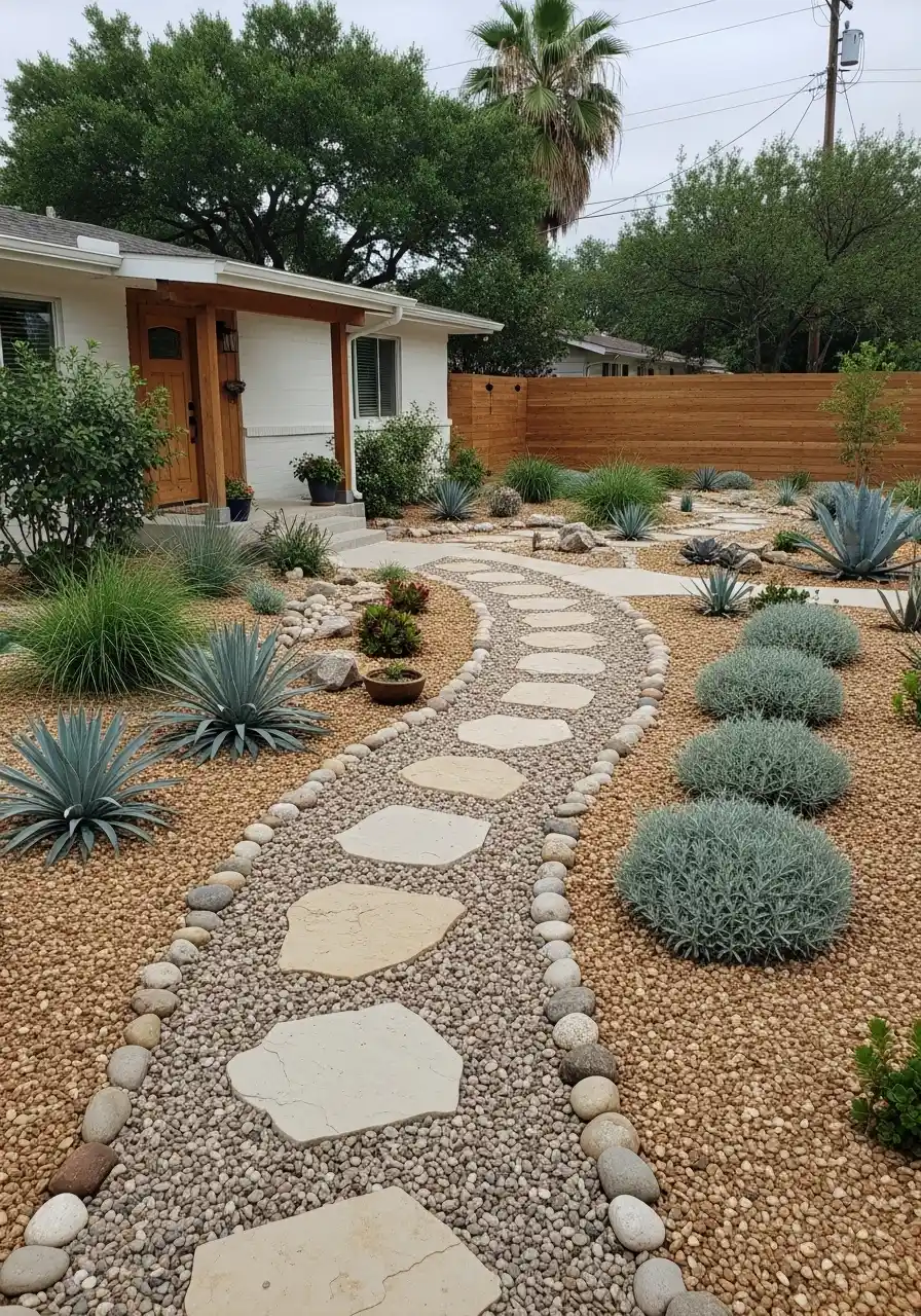 For Texas xeriscape front yard ideas, this is a great way to create a front yard that feels like it’s guiding you in. Use a different rock texture for the path center, then outline it with round river stones. The outline helps visually, but it also helps keep materials in place.