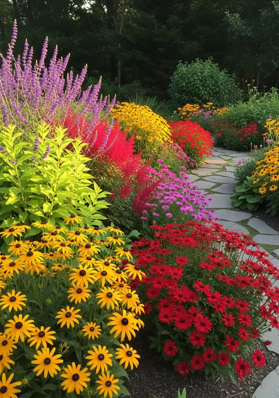 This one is loud and beautiful. Red flowers, yellow daisies, purple spikes, pink blooms, and bright green foliage all flowing along a stone path. It’s like someone turned the saturation up, and I’m not mad about it.
