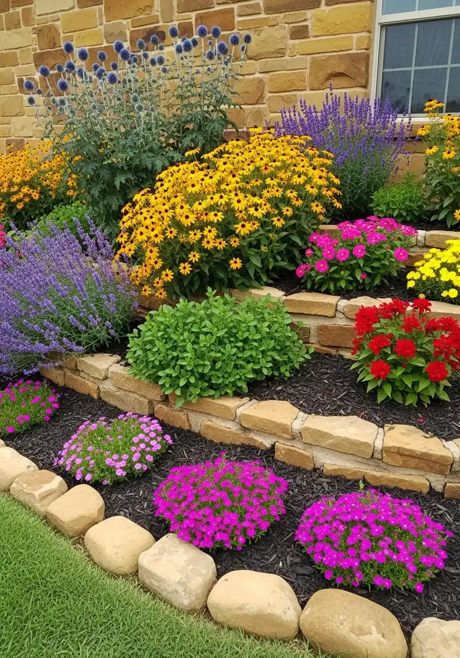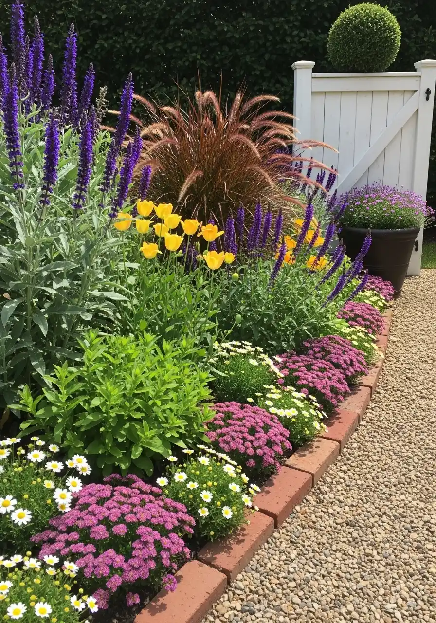 This scene is a clean edge bed along a gravel path, with bright purple salvia spikes, yellow blooms, and little mounds of pink flowers and white daisies. It’s got a nice rhythm, like repeated “bumps” of color. This is texas zone 8 landscaping for people who like order but still want fun.