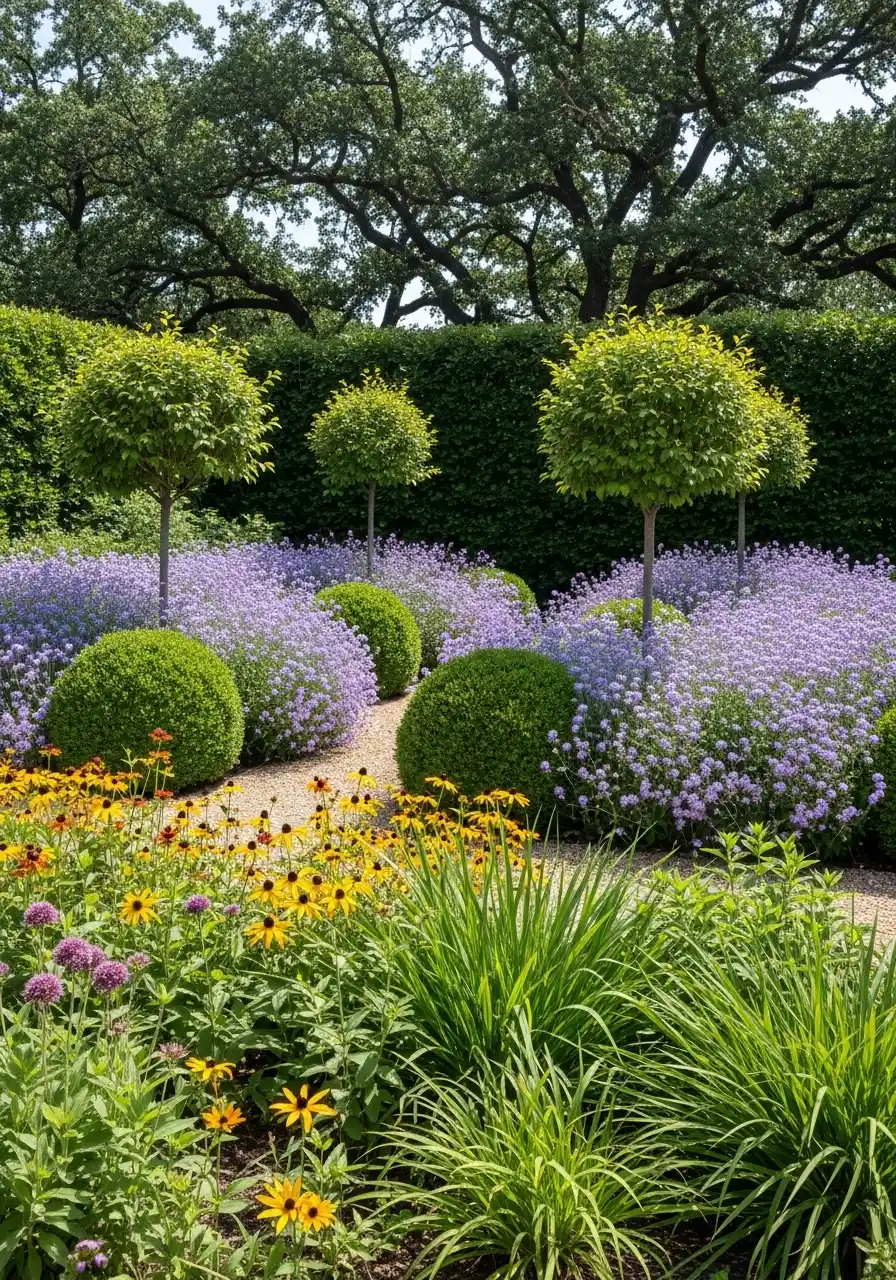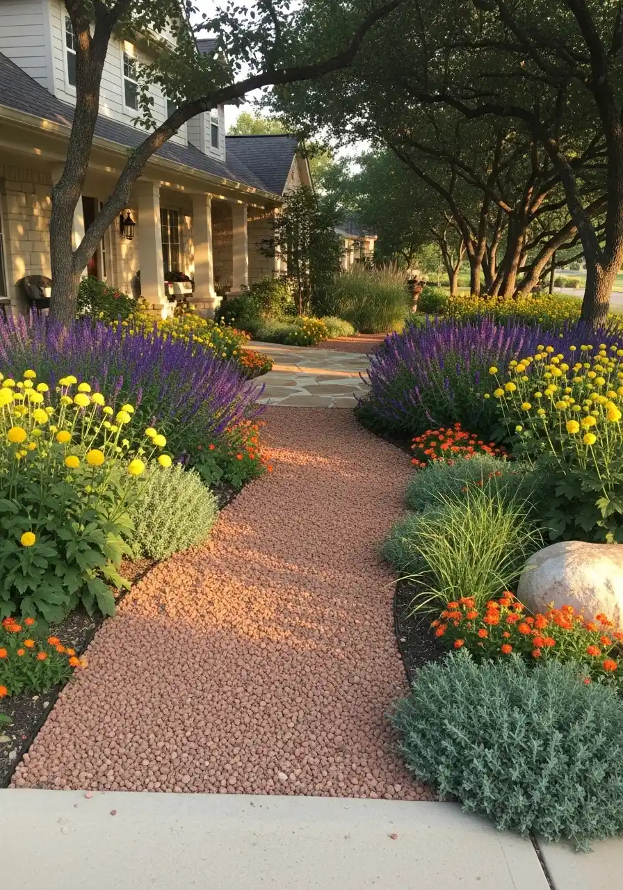 This idea is more quiet and dreamy. Big soft mounds of lavender-purple flowers, round green shrubs, and a simple gravel path winding through. It’s almost like a fancy garden that whispers instead of shouts. I think this style is perfect for texas zone 8 landscaping when you want something pretty but not overly busy.