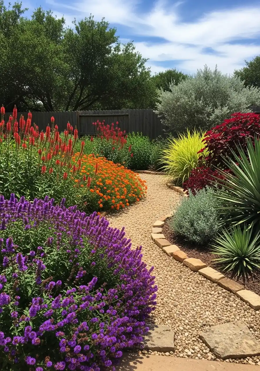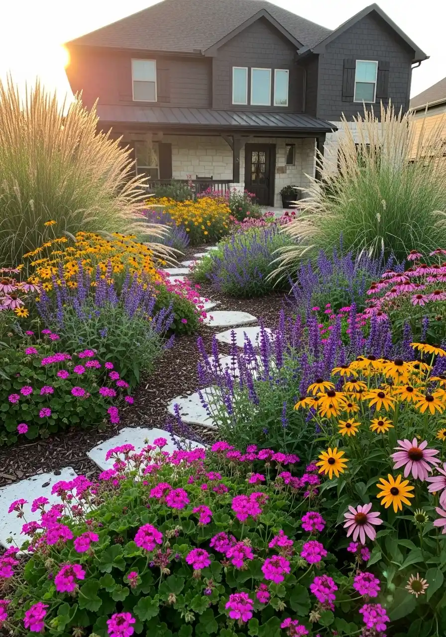 In texas zone 8 landscaping ideas, this is the “maximum color” style, and it works because the path is neutral. The stone path calms it down. Without that path, it could feel too busy. With it, the color feels guided, like it’s escorting you along.