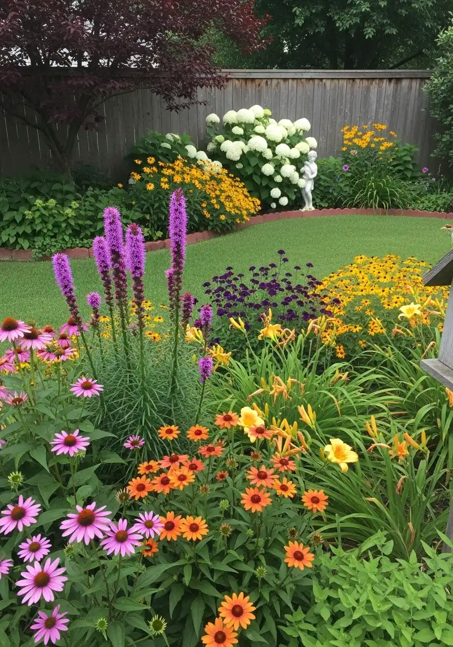 This image feels like a soft backyard hug. Lawn in the center, curved beds around it, and layers of flowers like coneflowers, daylilies, black-eyed Susans, and purple spikes. It’s colorful but still comfy, like a real family yard, not a showroom. texas zone 8 landscaping can totally be both pretty and practical.