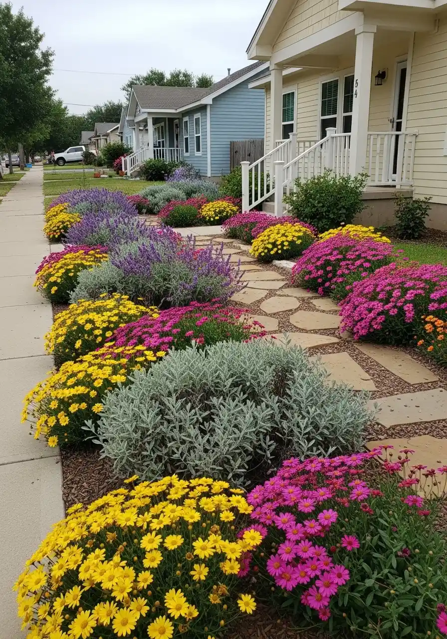 This last one is a long front yard bed by a sidewalk, filled with mounded flowers in yellow and magenta, plus silvery shrubs and purple spikes. It’s bright, but still tidy, and it makes the whole street look nicer. Honestly, this is the kind of texas zone 8 landscaping that makes you want to walk slower just to stare.