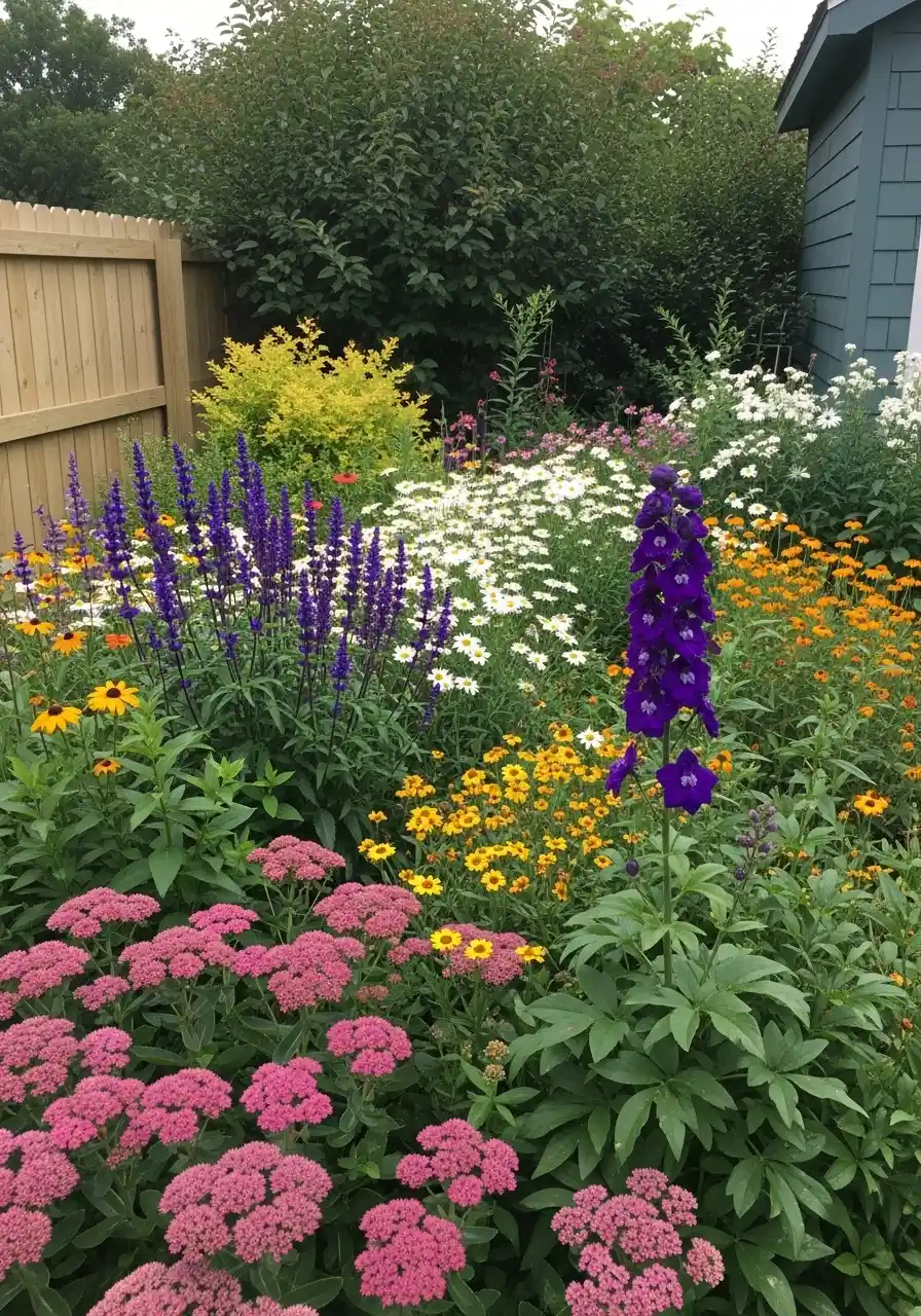 This one is pure happiness. Daisies, purple spikes, yellow blooms, and pink clusters all mixed together like a party. It’s the kind of bed that makes you stop and stare, and also makes you wonder if you could pull it off without it turning into a jungle.