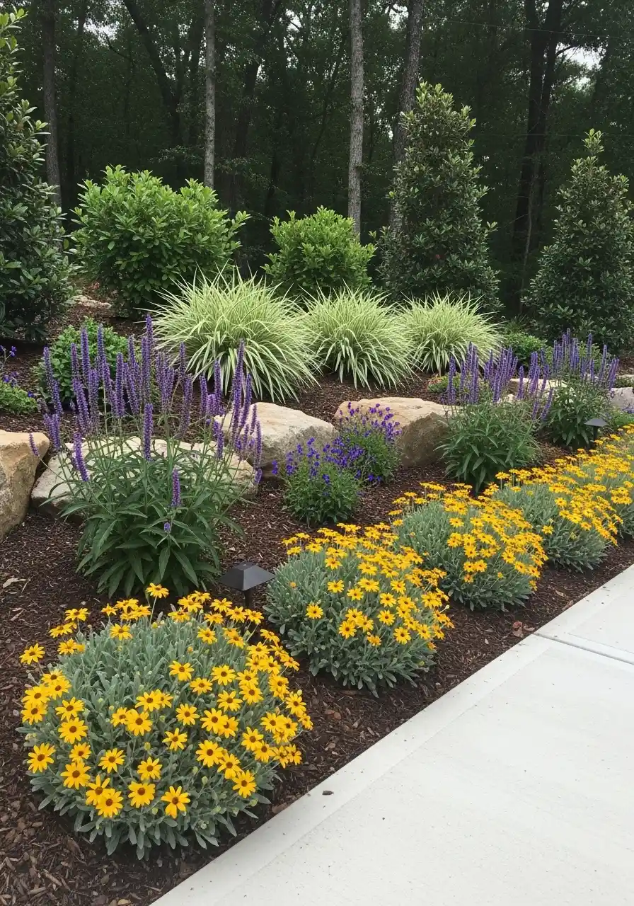 This one is calmer but still bright. Yellow daisy-like flowers up front, purple spires behind them, a few boulders for structure, and then big soft grasses in the back. It’s mulched, which makes it look finished and also helps the soil stay cooler.