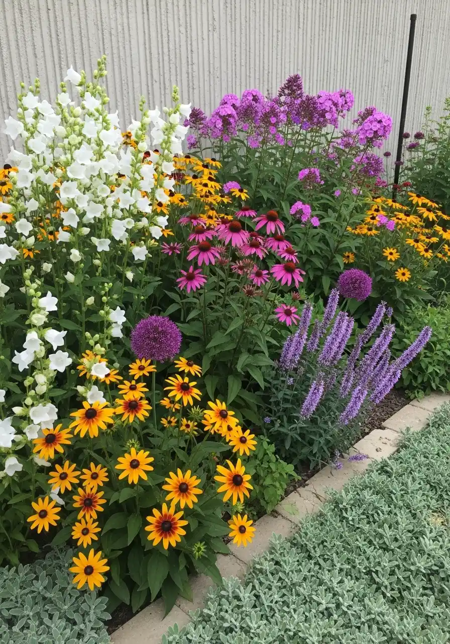 A fence-line flower bed with tall whites, purples, and black-eyed Susans