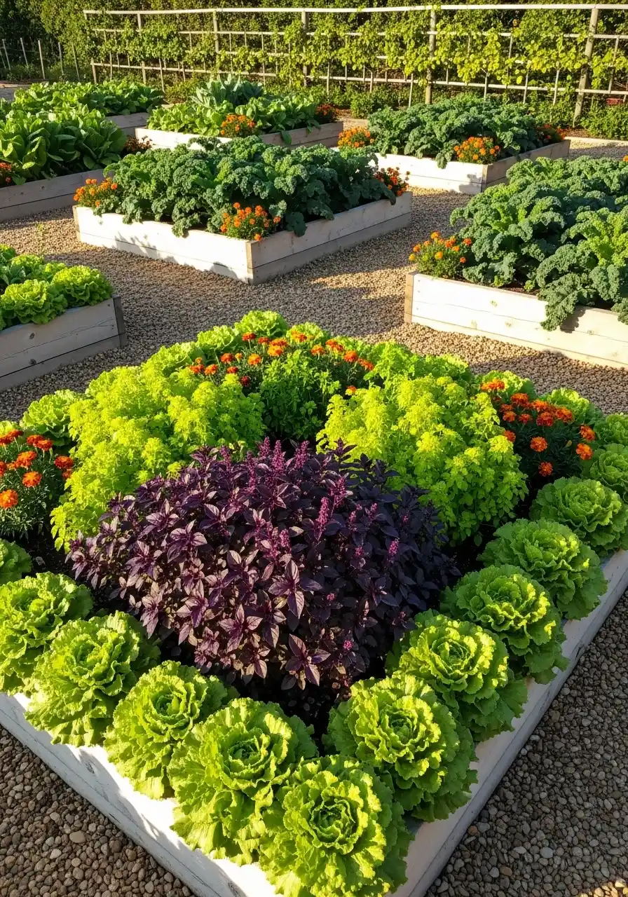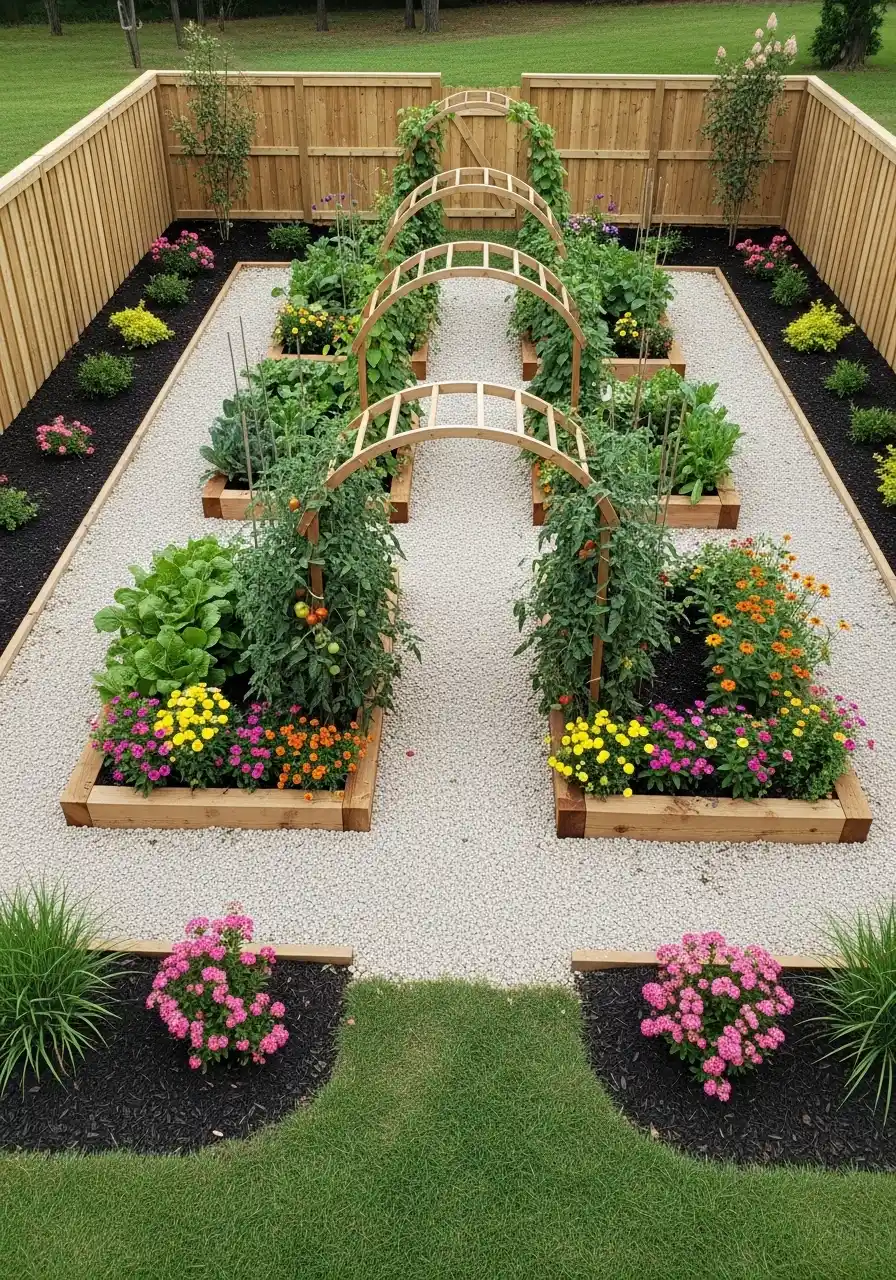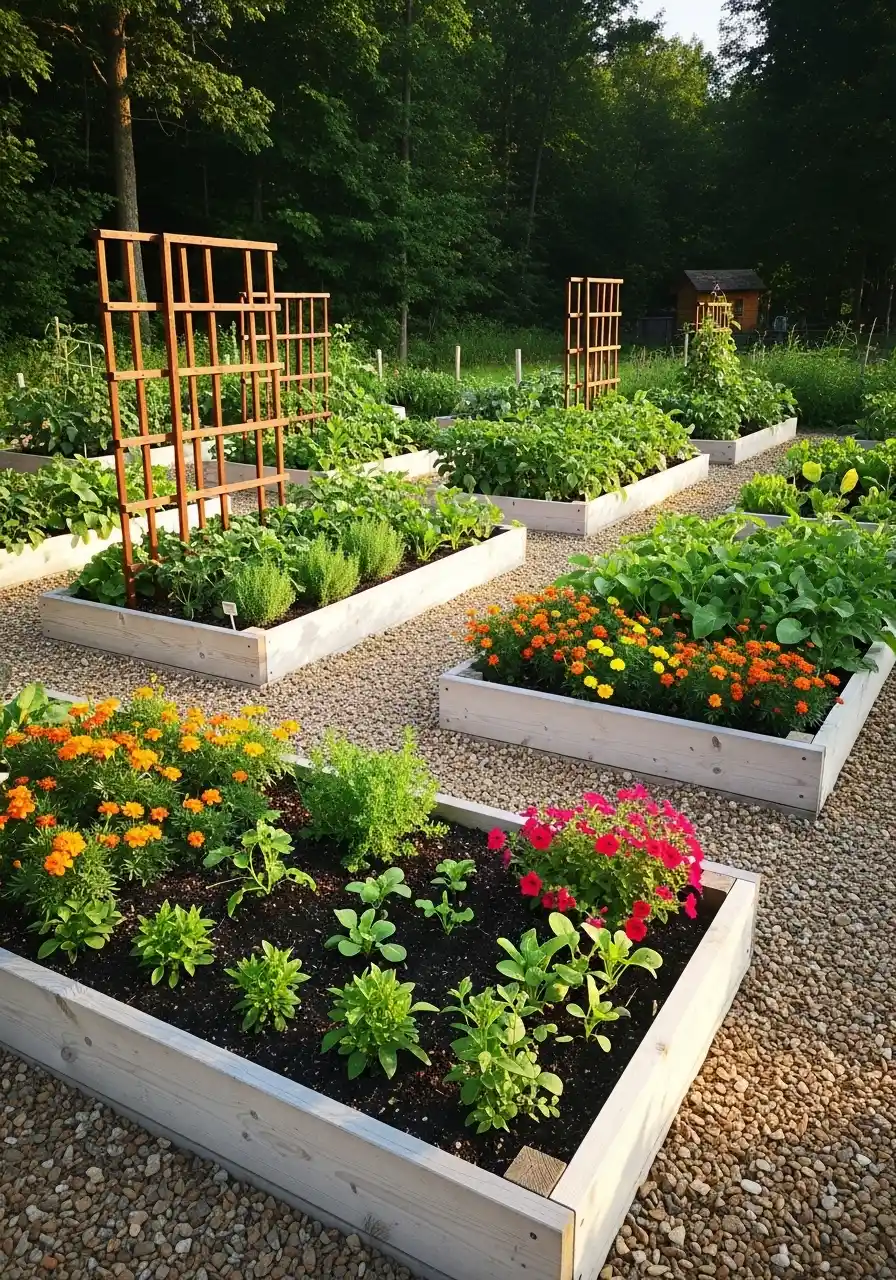 If you want this, pick one bed size and repeat it. Repeating shapes makes everything feel calmer. Lay landscape fabric under gravel if weeds are a big issue for you, but don’t overlap it sloppy or it’ll show. Tuck flowers at the corners or along the front edge so they act like living vegetable garden edging. It’s pretty, plus it helps with pests.