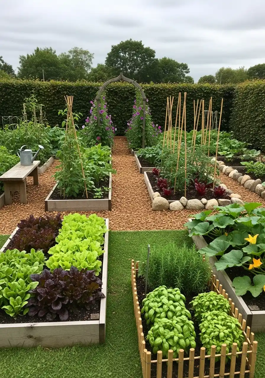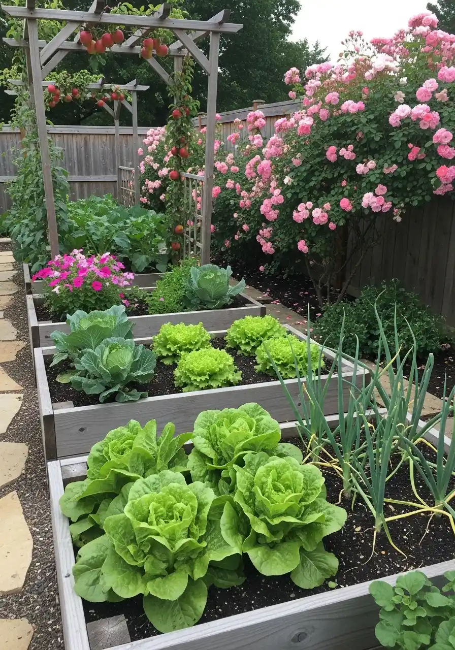 The raised beds with pink roses along the fence is a soft, sweet idea. It’s not just “food production,” it’s a garden you’d actually want to be in. This kind of vegetable garden border design helps the space feel less like a farm row and more like a backyard you love.