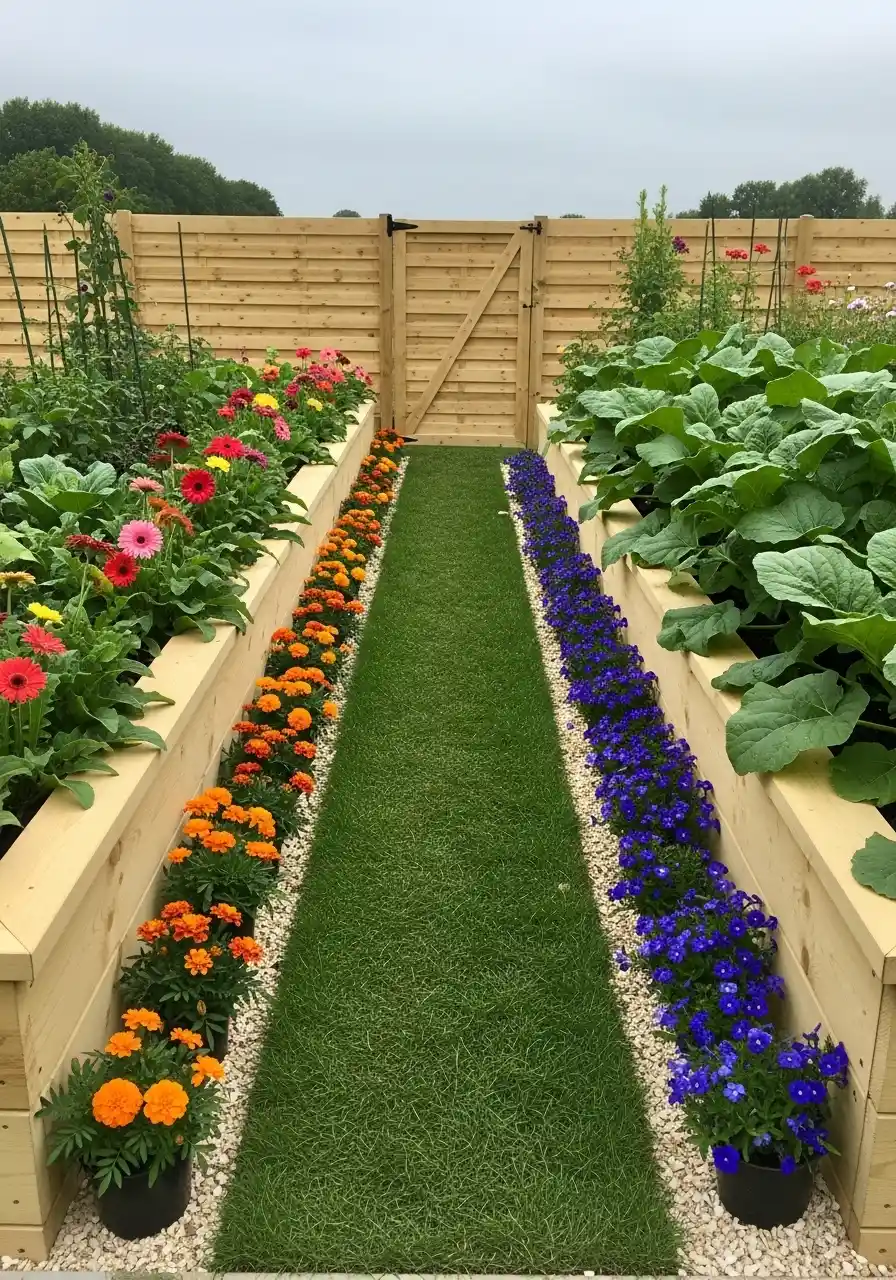 The long grass path with orange flowers on one side and blue flowers on the other is kind of genius. It turns a food garden into something decorative, not just practical. A vegetable garden border doesn’t have to be plain boards. It can be living color that also helps your crops.