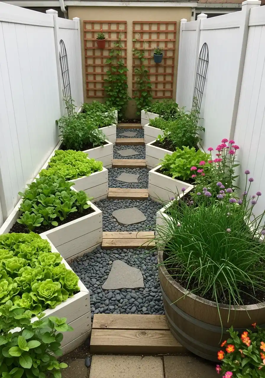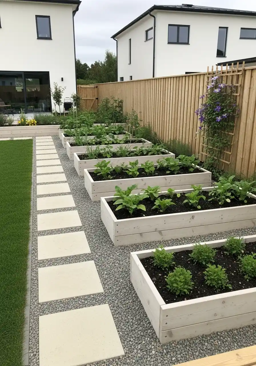 This design is perfect if your yard is long and skinny. The white raised beds look fresh and bright, and the gravel base keeps things from turning into a swamp after rain. The big square stepping stones feel modern, but they’re also practical because you can walk out there with a bucket and not slip.