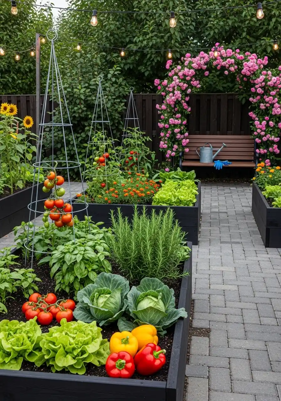 This one feels like a party garden. The black raised beds, the paver walkway, the string lights, and that rose-covered arch over the bench. It makes gardening feel romantic instead of like chores. A vegetable garden border can totally be part of your hangout space, and I think more people should do that.