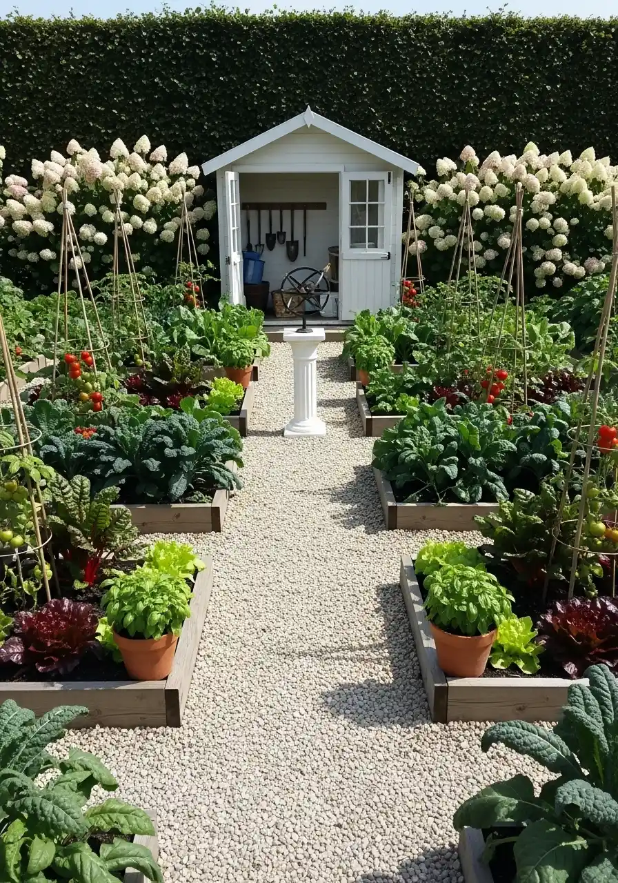 The garden with the little white shed at the end is super classic. It’s like a potager garden, where food and beauty mix together. The gravel path is clean and bright, and the beds feel evenly spaced. This vegetable garden border style looks expensive, but it’s mostly about repetition and neat lines.