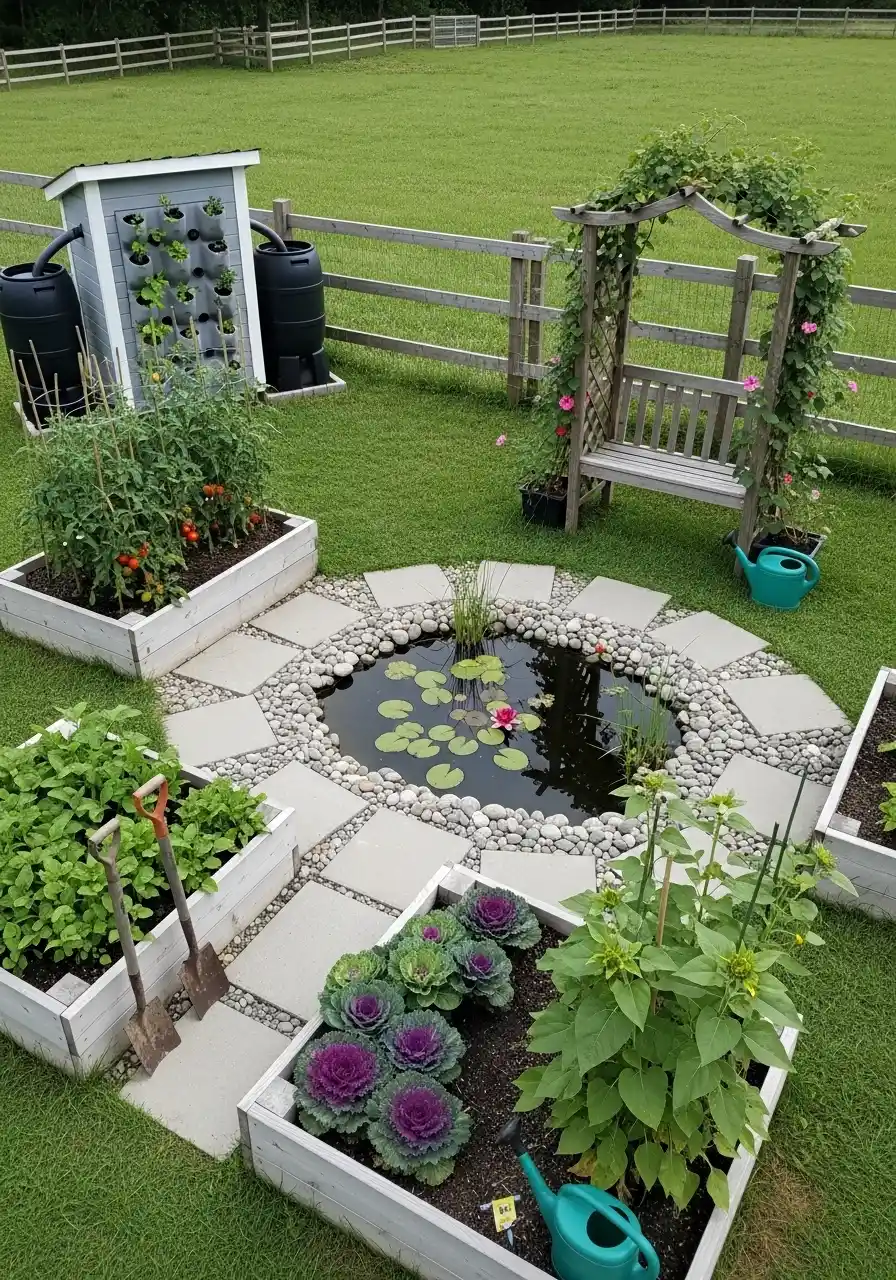 That small round pond in the middle is unexpected, and I’m kind of obsessed. It turns the garden into a space, not just beds on grass. A vegetable garden border around a central feature like water makes everything feel planned, like a tiny outdoor room.