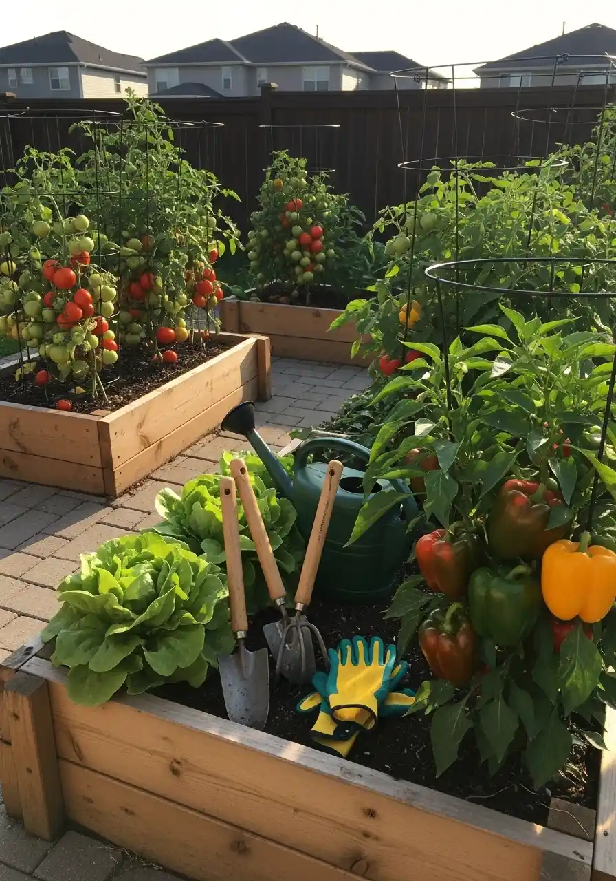 This next one feels like real life gardening. Tomato cages everywhere, peppers loaded up, tools sitting right there like you’re mid-task. It’s not staged, it’s working. A vegetable garden border in a backyard like this has to be sturdy, because you bump into it, lean on it, and sometimes trip on it.
