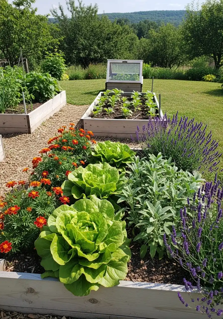 This one feels friendly. Like, you’d walk out barefoot and just stand there, staring at it for too long. The raised beds are simple wood, but the border effect comes from the plants around it, especially bright flowers like marigolds and the purple spiky stuff (lavender vibes). Flowers beside veggies are not just cute. They also help bring pollinators, and some can confuse pests.